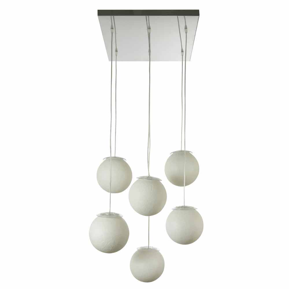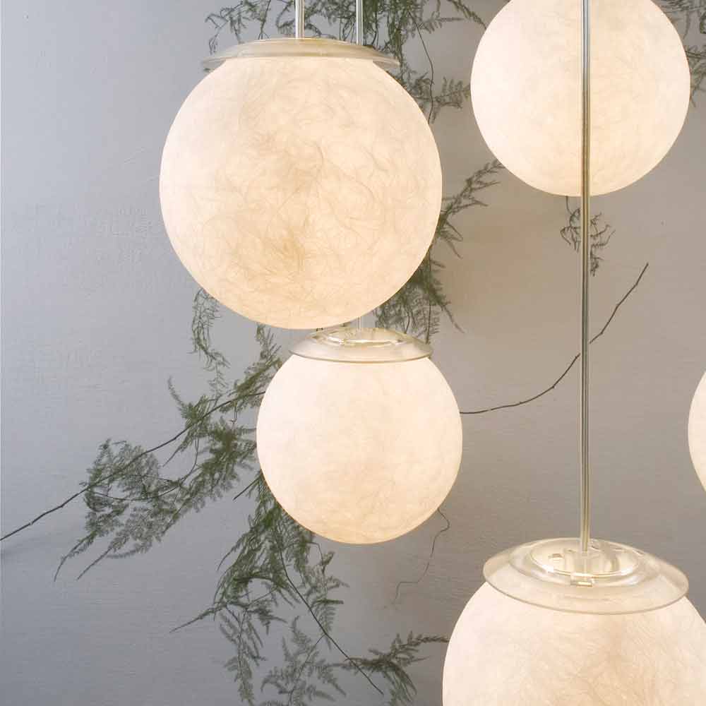 It has a steel structure and six sphere in Nebulite®, a material composed of resin and fiber, whose veins give the lamp a particular lunar effect. Thanks to its charming and elegant design it is suitable for decorating your living or contract area.