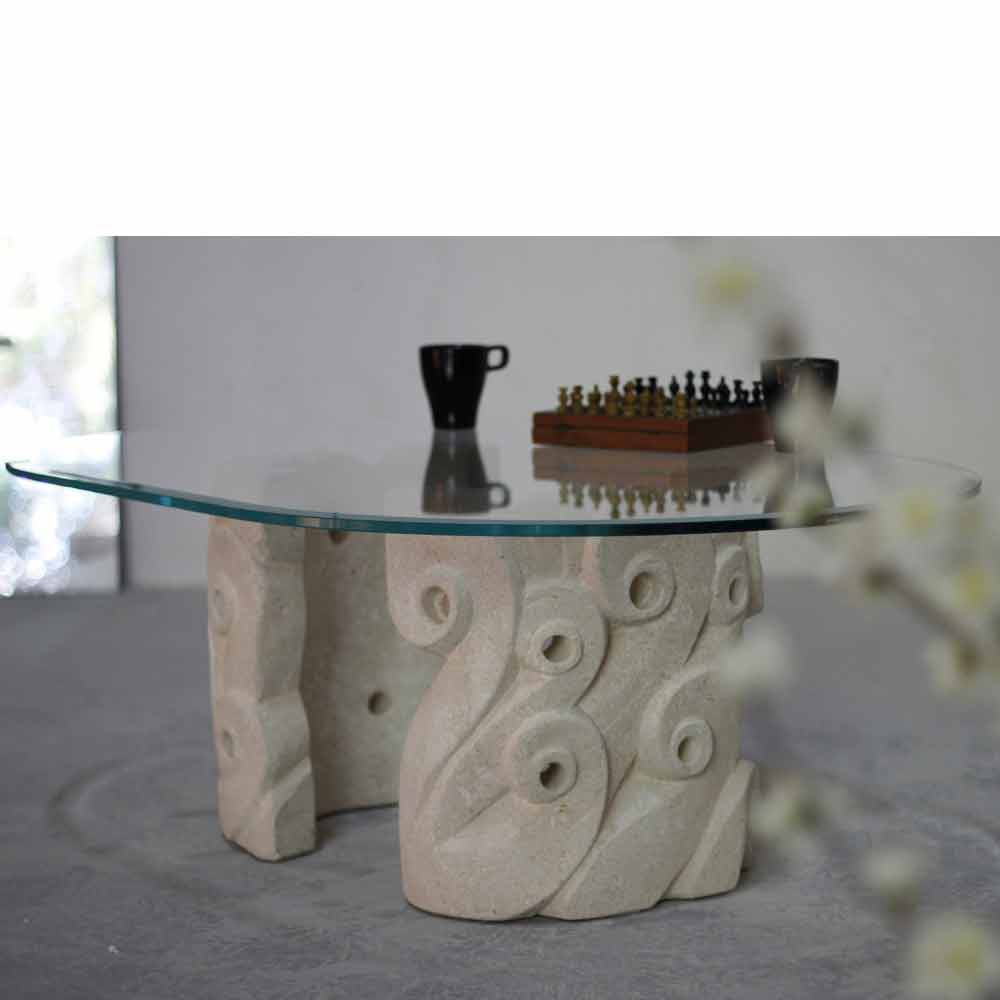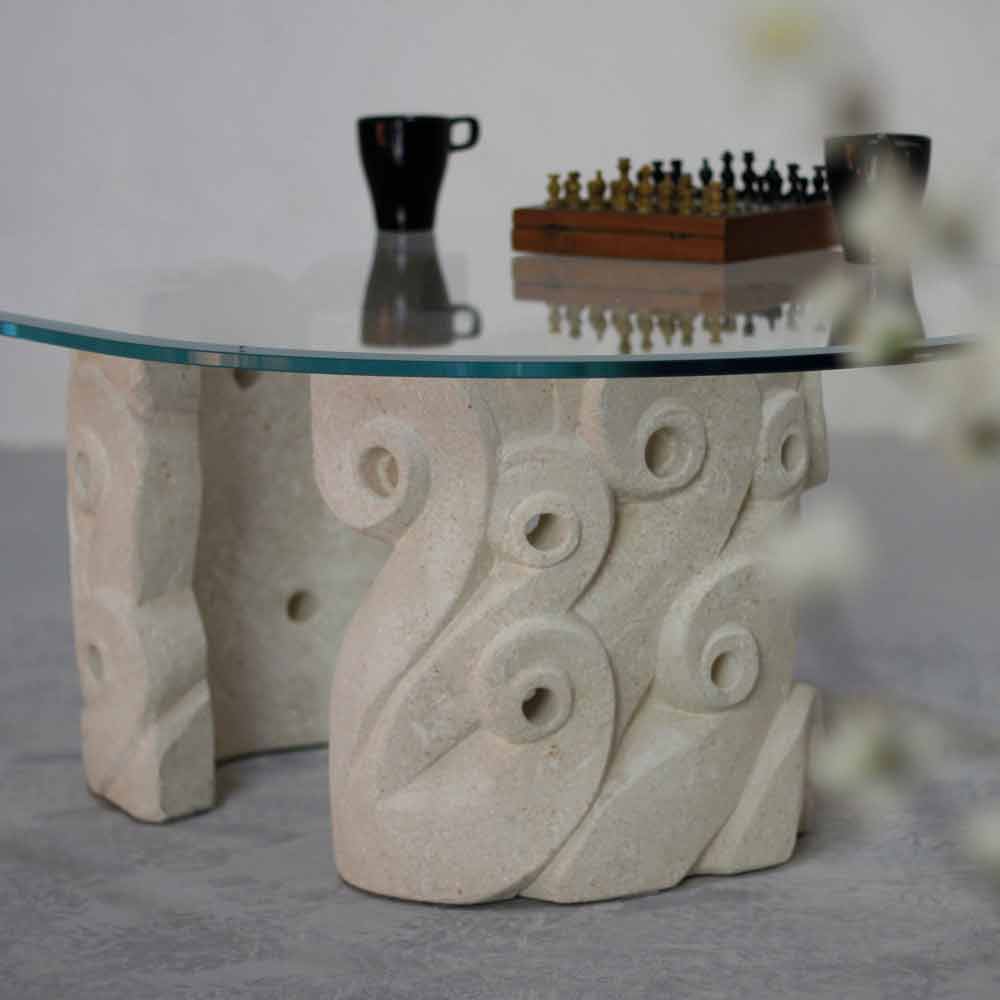The coffee table Lindos is entirely made in Italy. Its base is made of Vicenza natural stone and it has been hand-carved from the original stone block. The table top is made of float crystal (12 mm thickness), layd on the base.