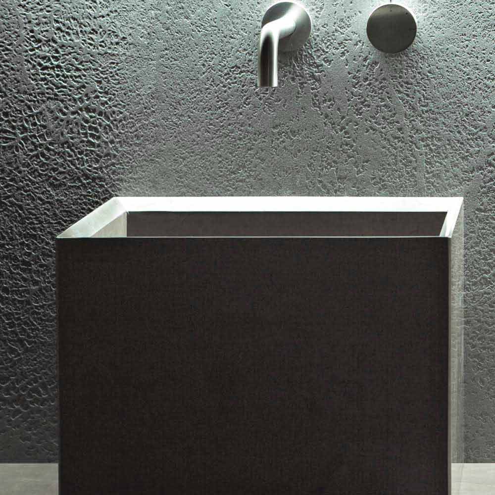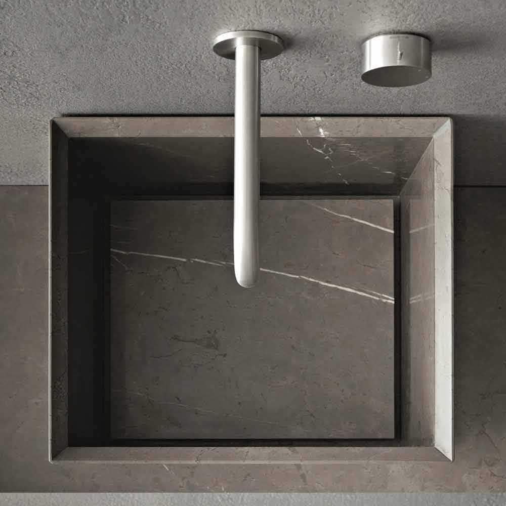 Square countertop washbasin, modern design in natural stone, with hidden drain.