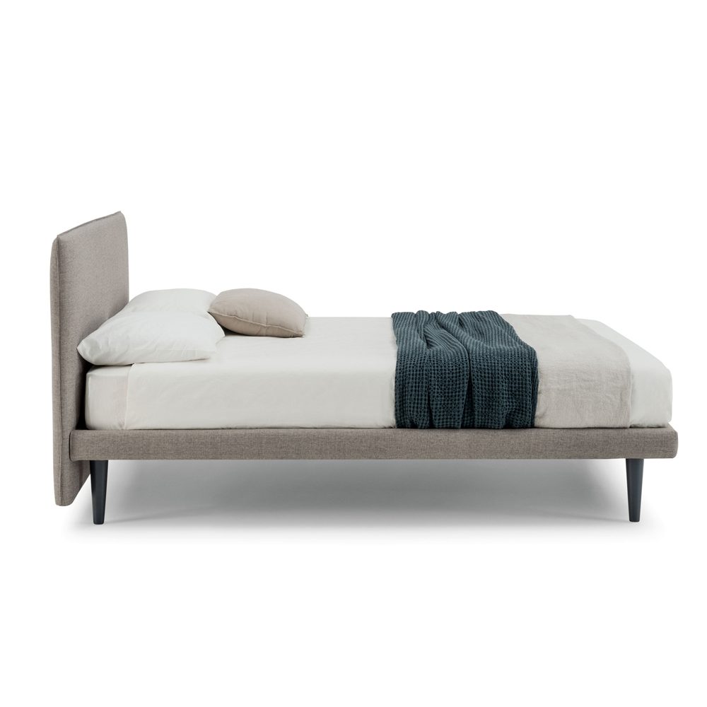 Designer double bed with thin base, Gaya New by Bolzan The Gaya New double bed with a contemporary design is characterized by a thin base, which helps to recreate minimal and essential lines. In this bed, functionality is combined with aesthetics, simple and clean, without superfluous details. However, it is able to give comfort and personality to the environment. It is completely removable. The structure is made of MDF wood (acronym for Medium Density Fibreboard, i.e. medium density wood fibre panel) thickness 40 mm, covered in polyurethane foam without chlorofluorocarbons according to UNI standards and lined with velfodera stable to light. The bed is supplied with a slatted base with metal structure, curved frame with 50x37 mm profile painted with epoxy powders. Normal orthopaedic slatted base, 15 slats in curved beech plywood 68x8 mm per bed. Slanted vase feet h.26