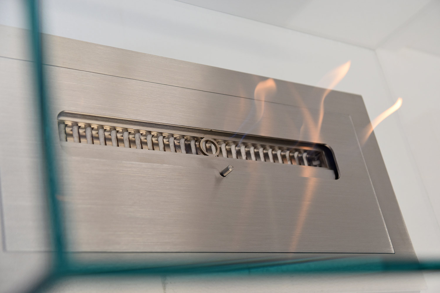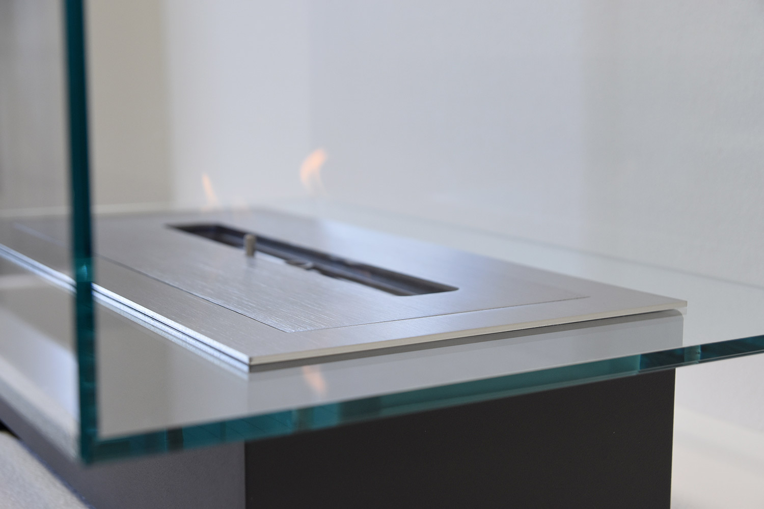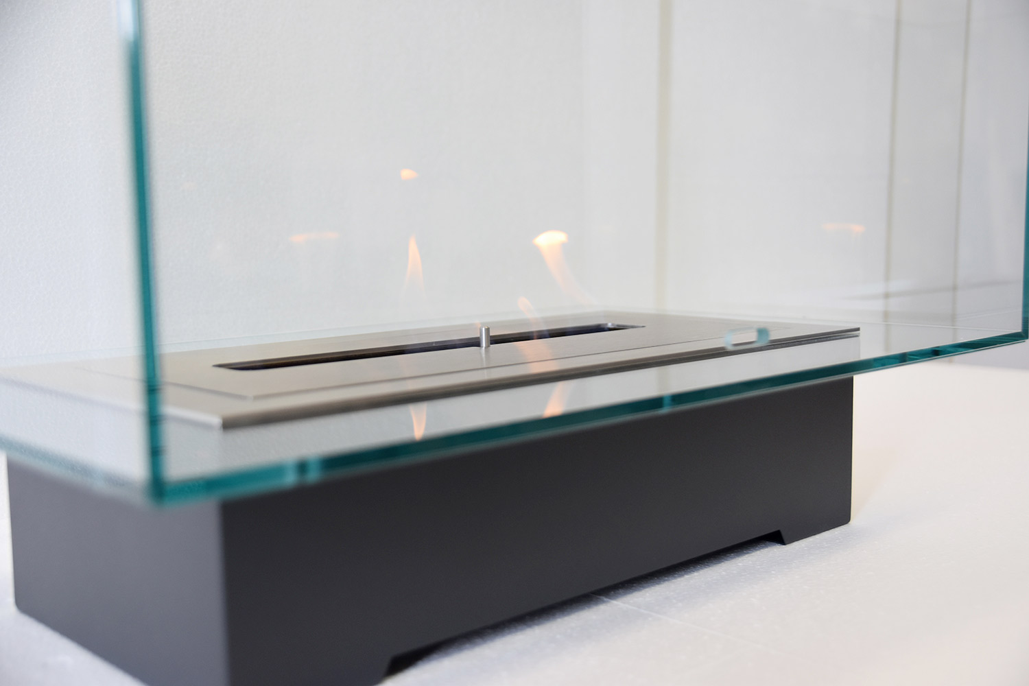 Its particular and suggestive design, in fact, consists of a transparent rectangular glass space that contains the flame, creating a sort of continuity with the surrounding environment and becoming the protagonist thanks to the small base that highlights the heat of the fire, from enjoy in total relaxation and safety.
