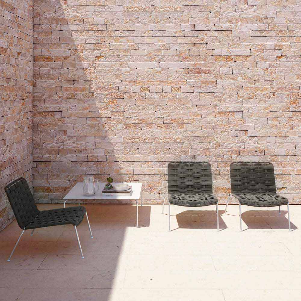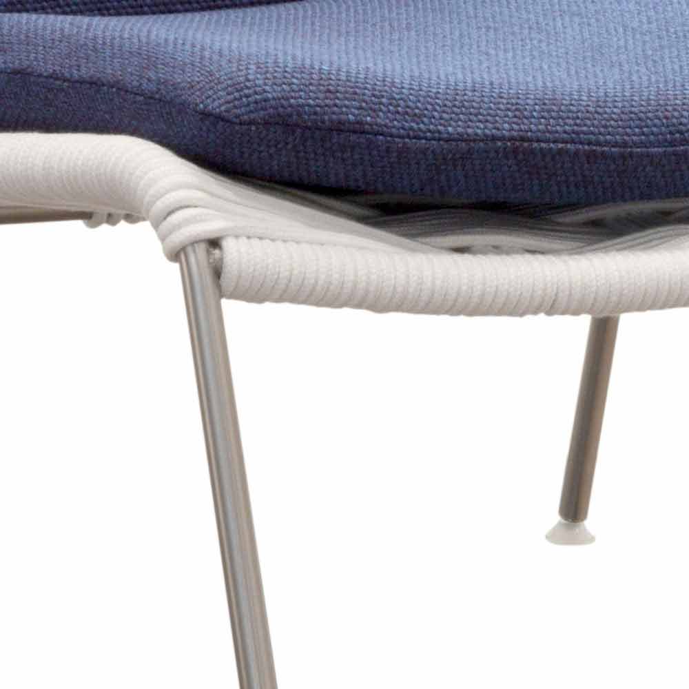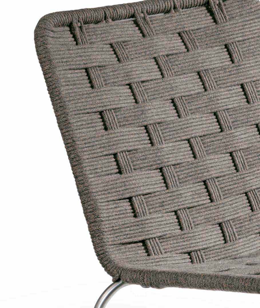 It is a small armchair with a satin stainless steel structure. Seat and backrest woven in acrylic cord with the possibility of choosing between colors: