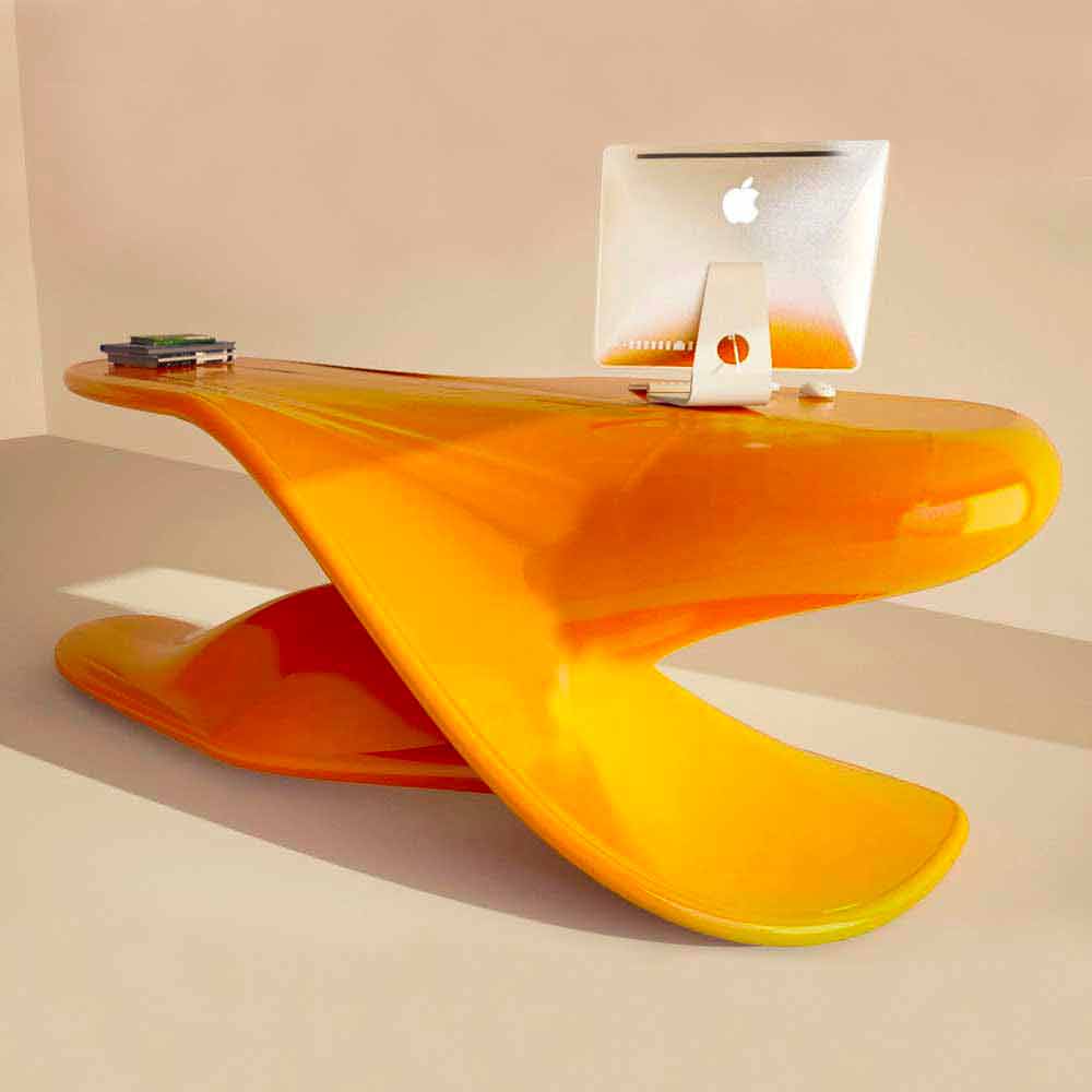 Top Design Desk. Material: Solid Surface; The theme of the Archer office desk is interpreted as matter within the space, which suggests a certain dynamism within the office room. A completely new shape, characterized by hollow and concave parts, made in 3 color variations, for a modern but classy office proposal. Glossy lacquered finish. Available in different color variations.