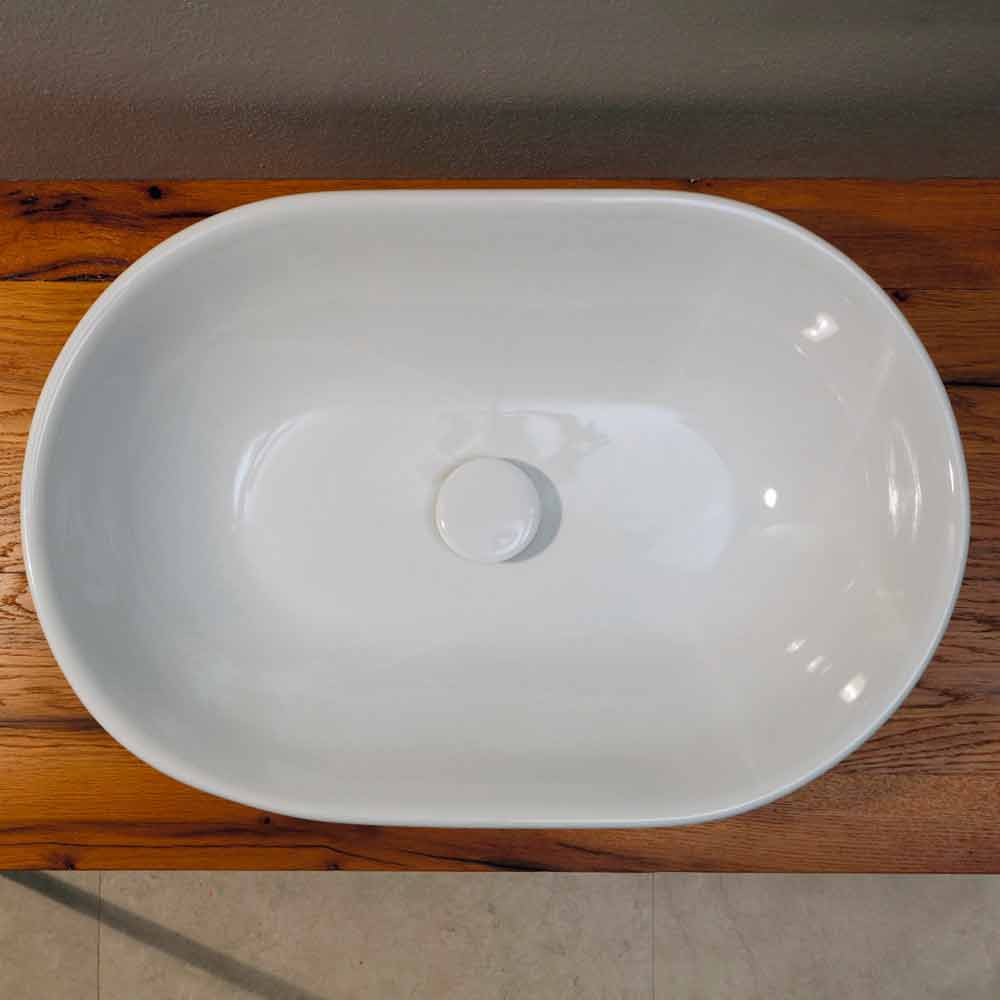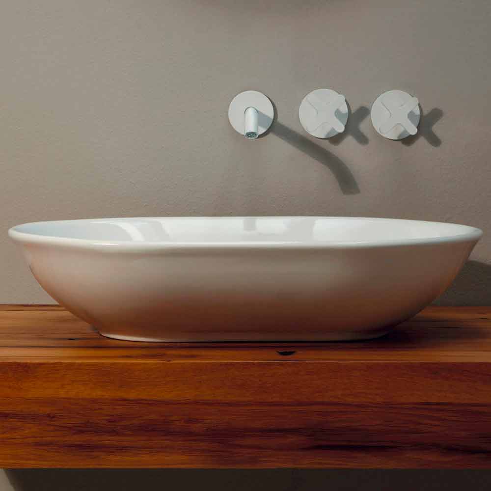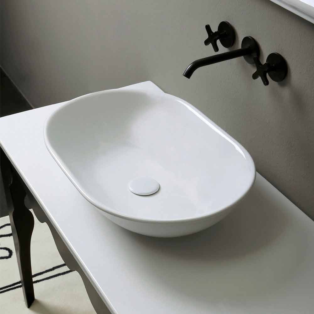 Modern design ceramic countertop washbasin made in Italy Design washbasin reminiscent of the archetype of the toilet bowl. Its oblong shape enhances its function. Suitable for those who want a romantic shape with a light retro flavor.