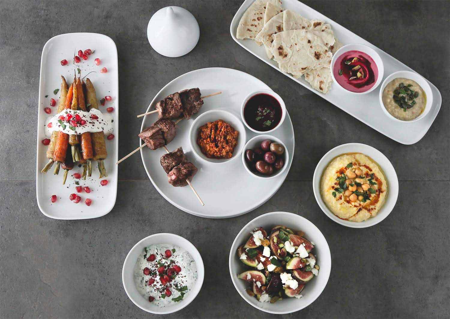 Set of modern aperitif plates with bowls, plate with cloche and rectangular plate in designer porcelain, 8 pieces.