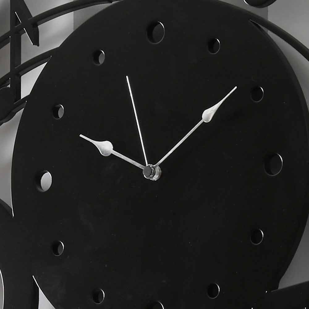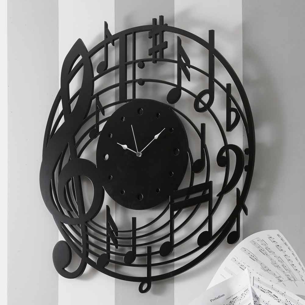 Large wall clock, round and modern design with musical notes in black wood and made in Italy.