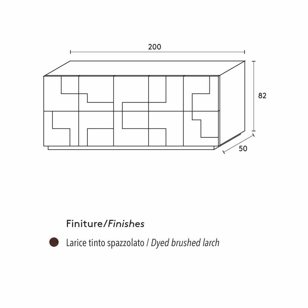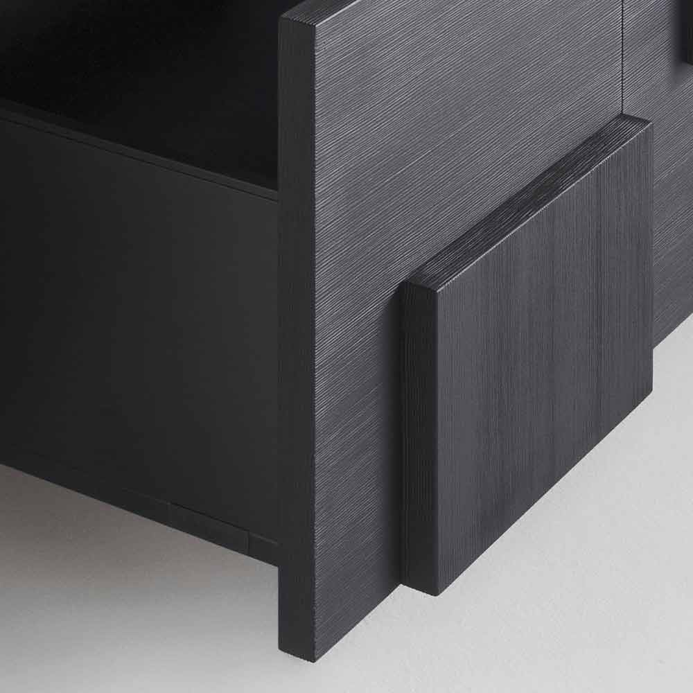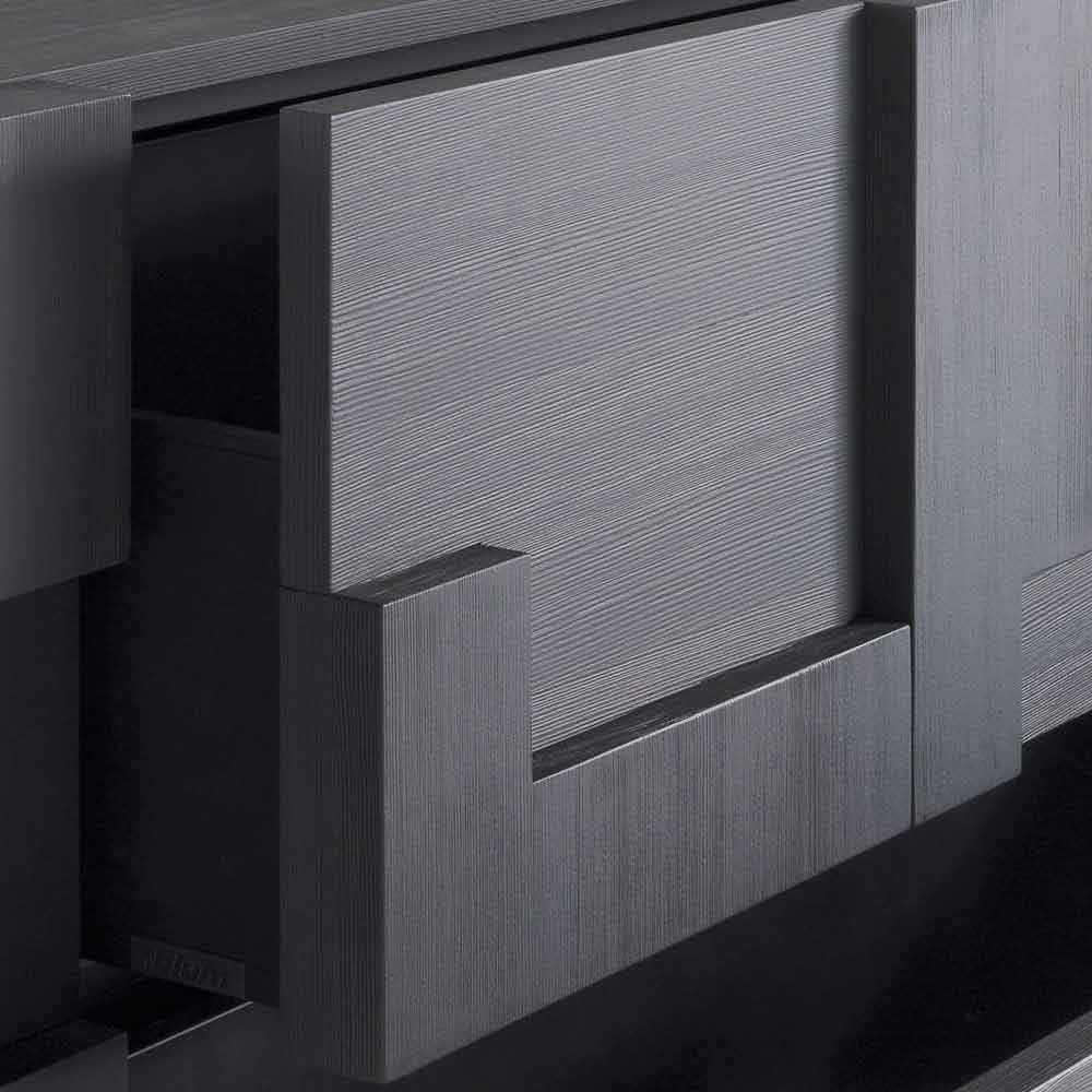 Living room storage unit made of brushed thermo treated larch wood. It is provided with n°4 compartments ( n°2 doors and n°2 drawers). The inner shelves are made of lacquered MDF.
