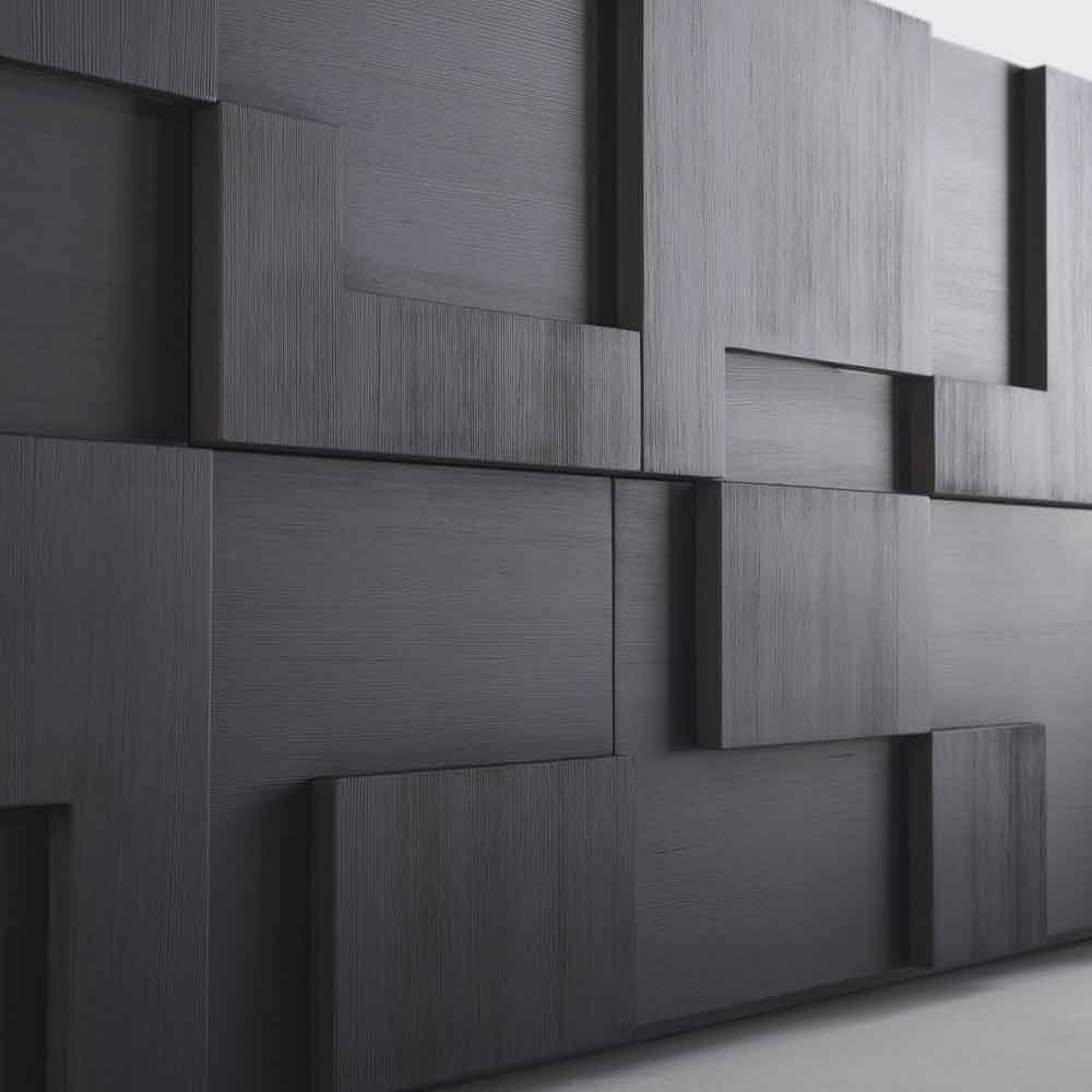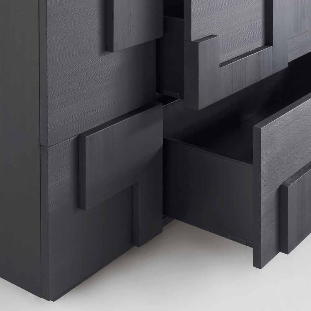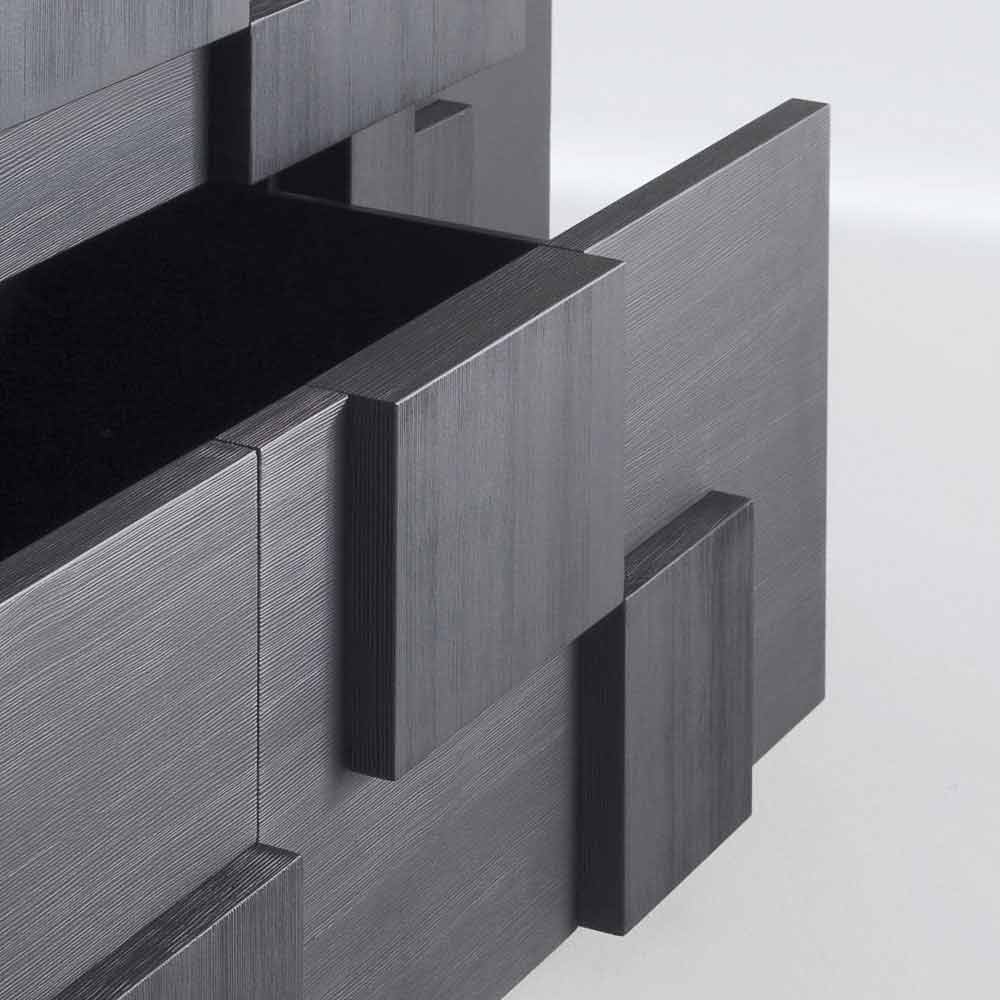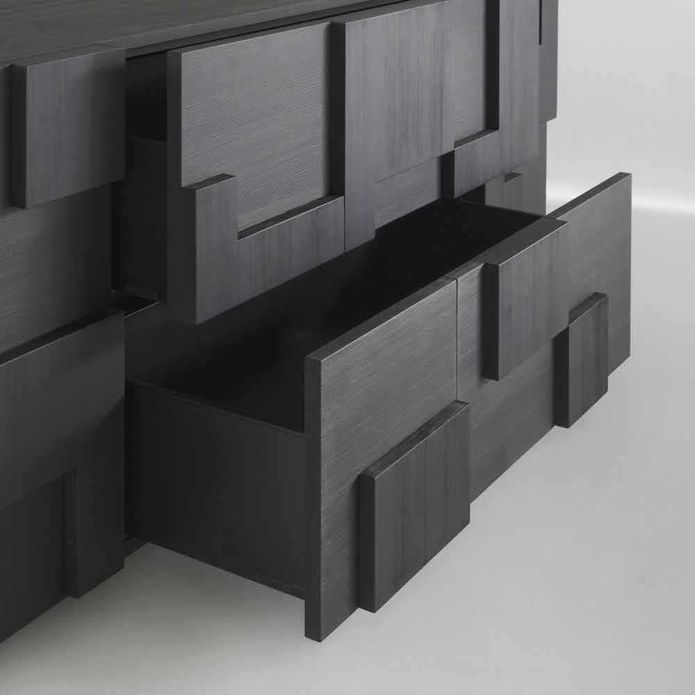 Living room storage unit made of brushed thermo treated larch wood. It is provided with n°4 compartments ( n°2 doors and n°2 drawers). The inner shelves are made of lacquered MDF.
