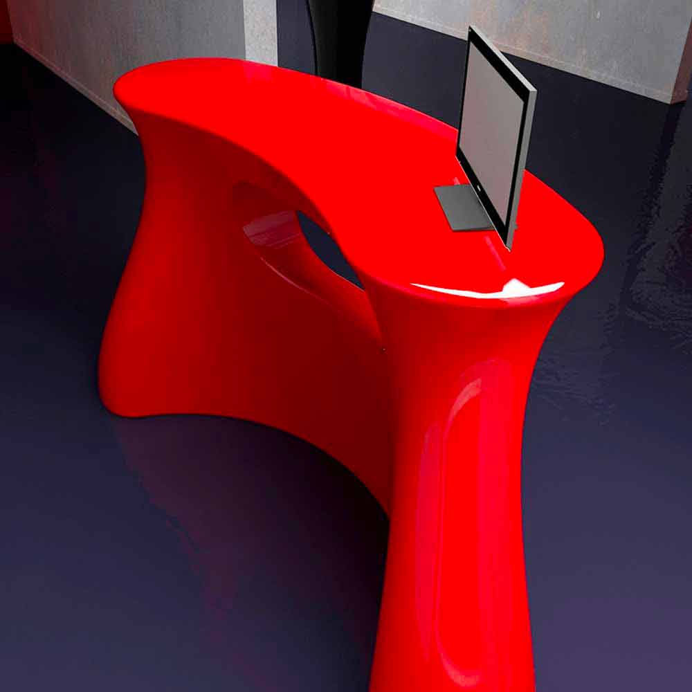 Desk Design. Material: Solid Surface; Desk Bob for customer reception or cash register with sinuous and organic shapes. Considering both the customer and the user to be important, Bob was designed to facilitate the latter's work through curves and counter-curves that make it compact and functional. The front photo is a convenient showcase for products or samples and, if necessary, becomes a space for brochures and information material. Its versatility makes it suitable for restaurants, discos, beauty centers, tourist information and in general for any activity that has to do with the public. Glossy lacquered finish. Available in different color variations.
