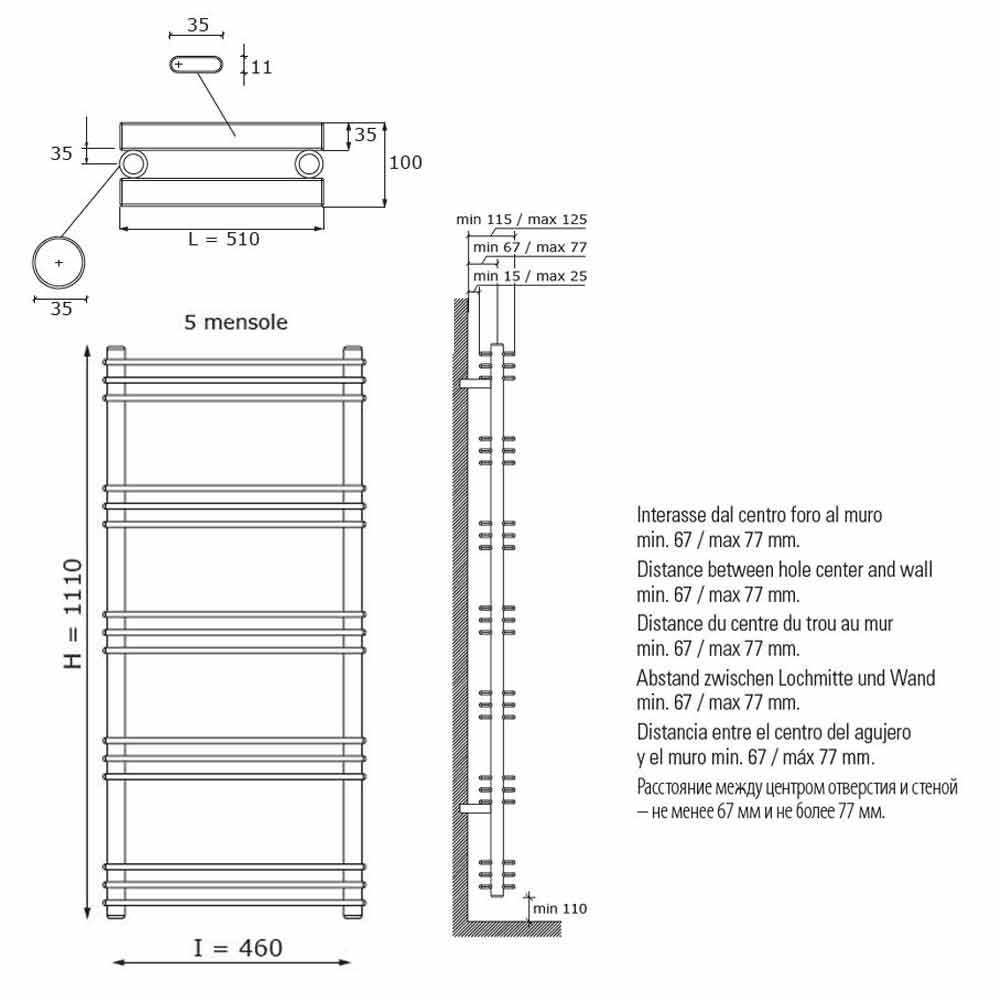 Dimensions *:- H 1110 x L 510 x P 35 x Inter. 460 mm x Output w (Δt50 *) 530; Yield w (Δt30 *) 290; Yield w (Δt26 *) 240.