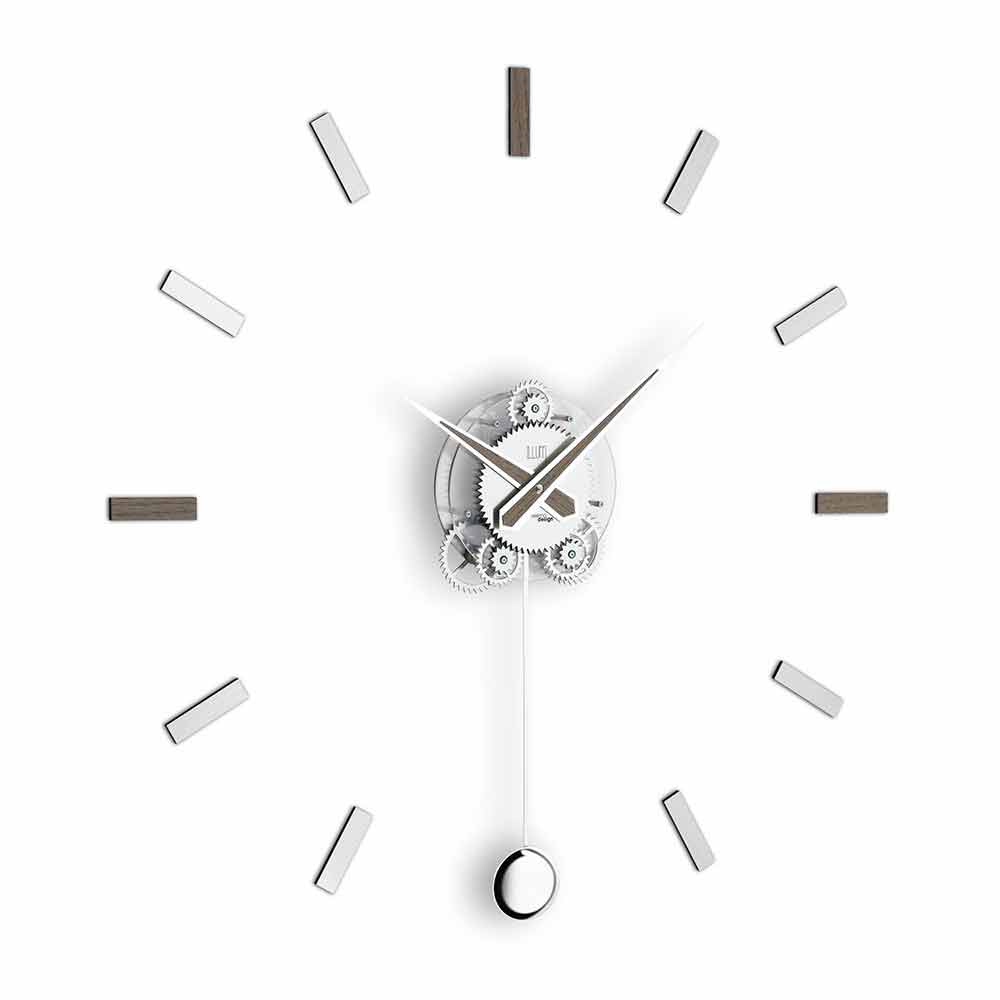 Modern design wall clock Baba Pendolo, with pendulum-clock mechanism. Baba Pendolo is not only a clock but a furnishing accessory which, thanks to its dimensions can suit any typology of modern furniture. The chromatic combinations, obtained with particular and current essences give the interested room refinement and originality.