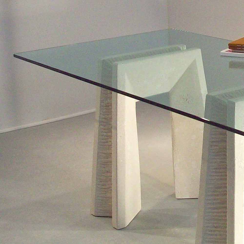 The dining table Arianna is entirely made in Italy. Its base is made of Vicenza natural stone and it has been hand-carved from the original stone block. The table top is made of float crystal (15 mm thickness) layd on the base.