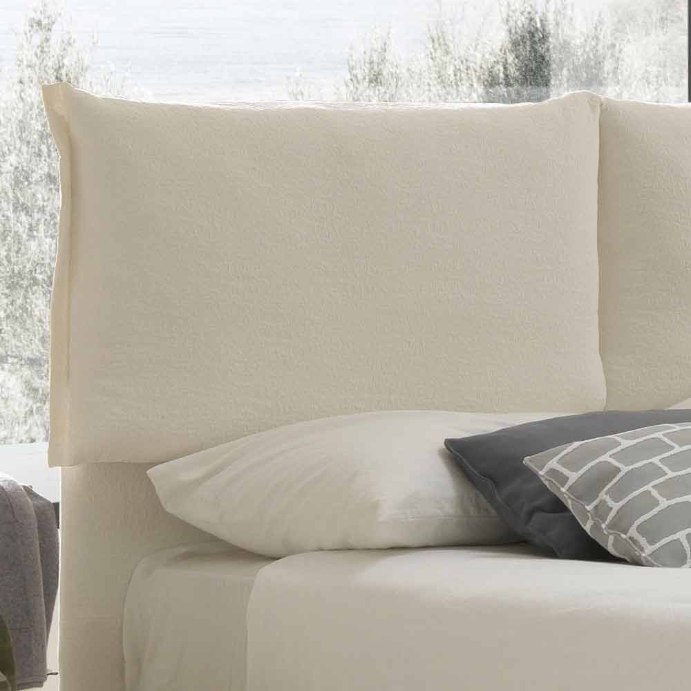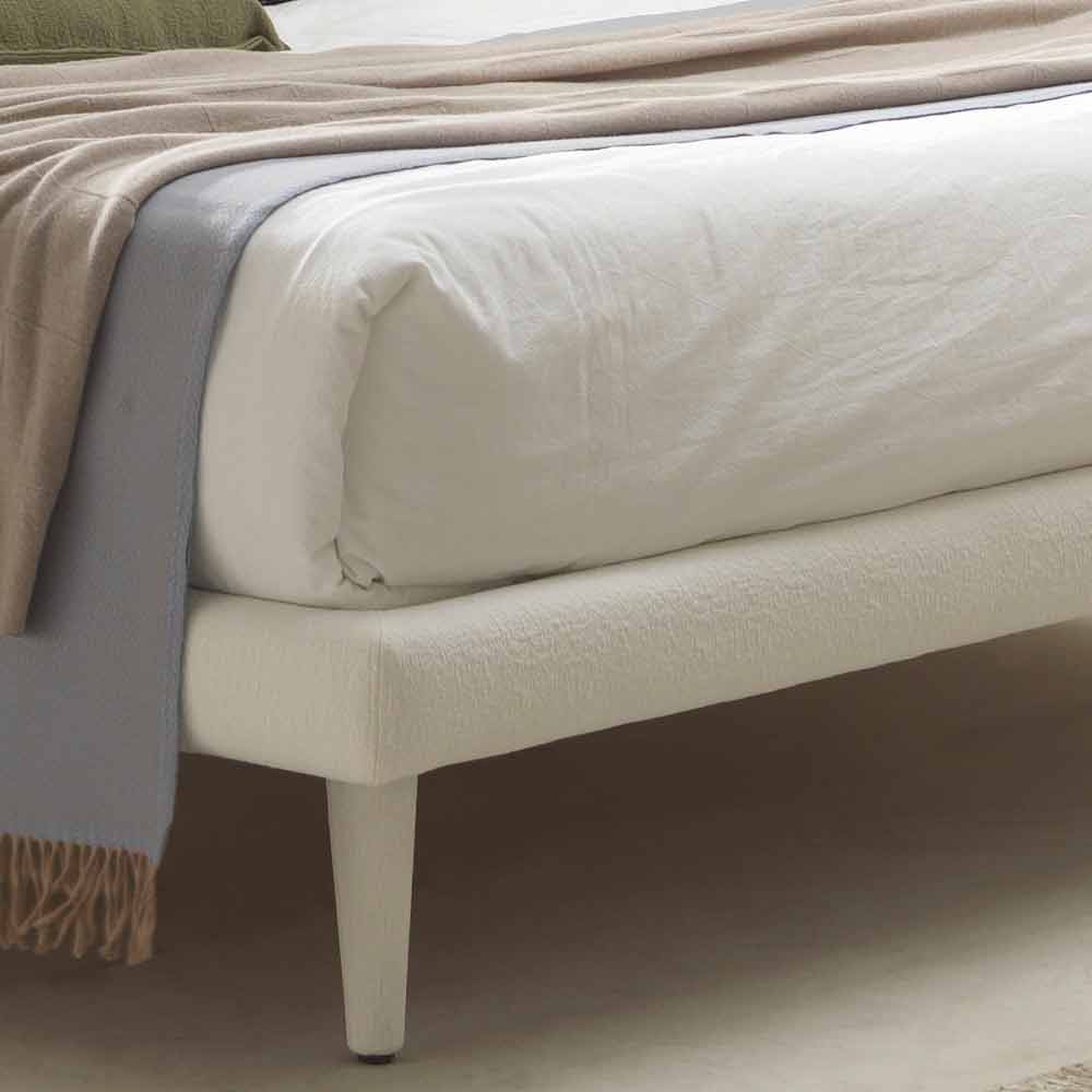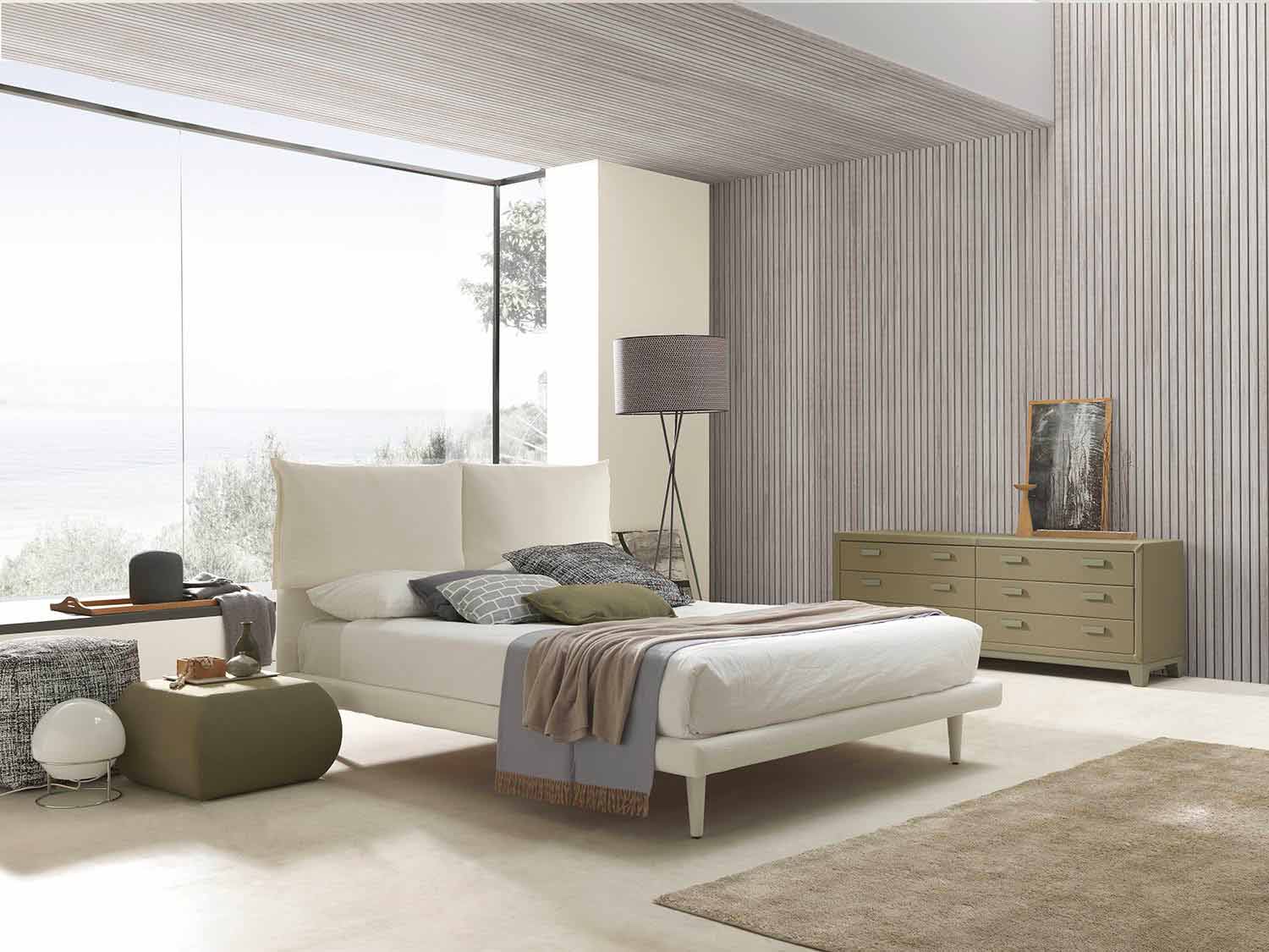 Iorca by Bolzan modern design double bed, made in Italy The Iorca double bed is characterized by a thin 9 cm high base, which gives the structure lightness and simplicity. The peculiarity of this bed is the large and comfortable headboard cushions. Iorca is designed to make the bedroom a space designed for relaxation where you can enjoy pleasant moments of comfort. The soft and simple lines create an intimate atmosphere. It is also completely removable. The structure is in MDF thickness mm.40, covered in polyurethane foam without chlorofluorocarbons according to UNI standards and lined with velfodera stable to light. The bed is supplied with a slatted base with metal structure, curved frame with 50x37 mm profile painted with epoxy powders. Normal orthopedic slatted base, 15 slats in curved beech plywood 68x8 mm per bed. Vase feet H 26 cm, white lacquered