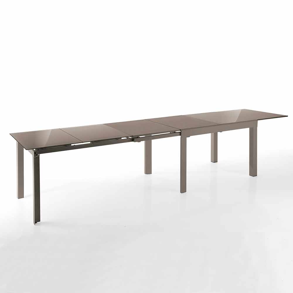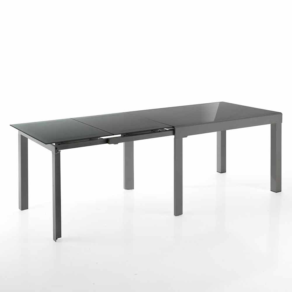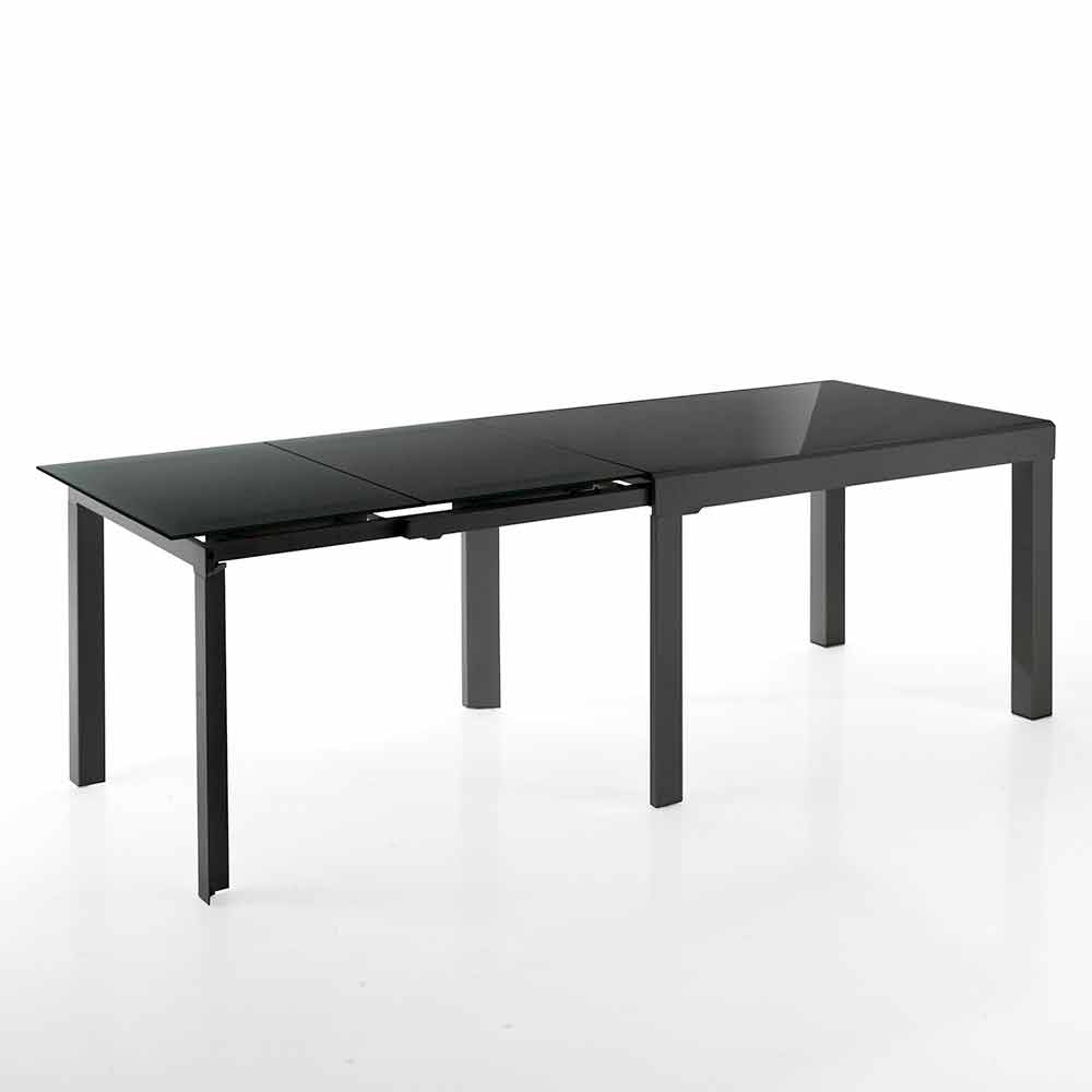 Guerriero is a practical and exuberant extendable dining table made with a tempered glass top (8 mm thick) and a painted metal base , available in three different finishes: