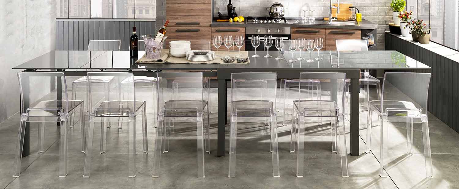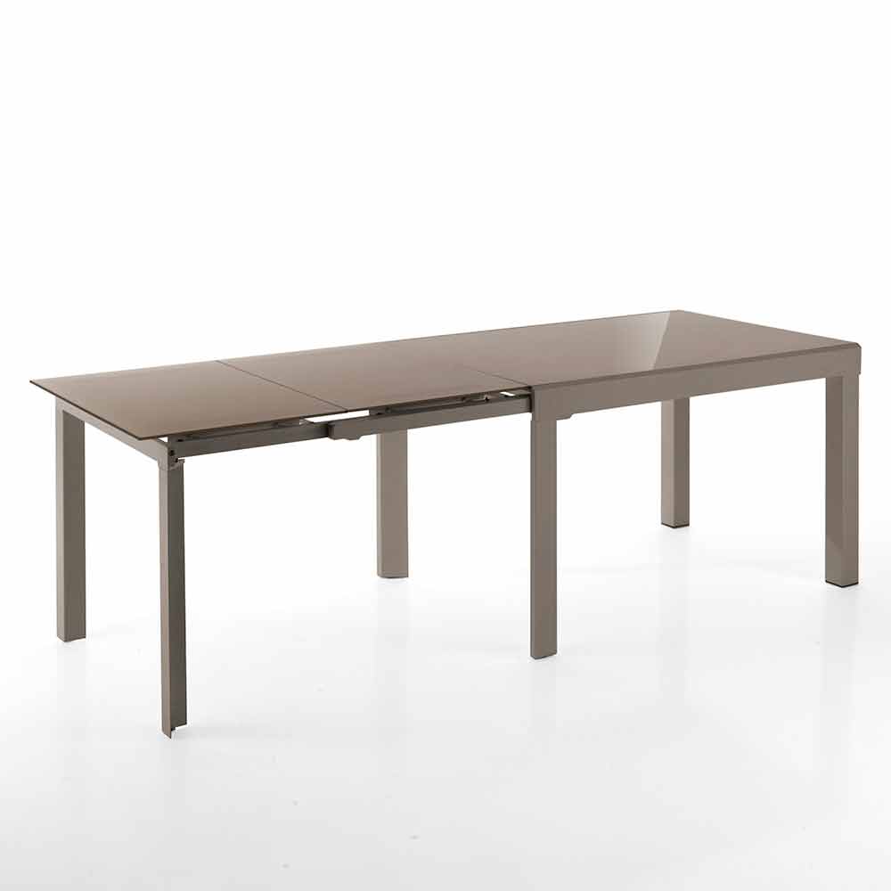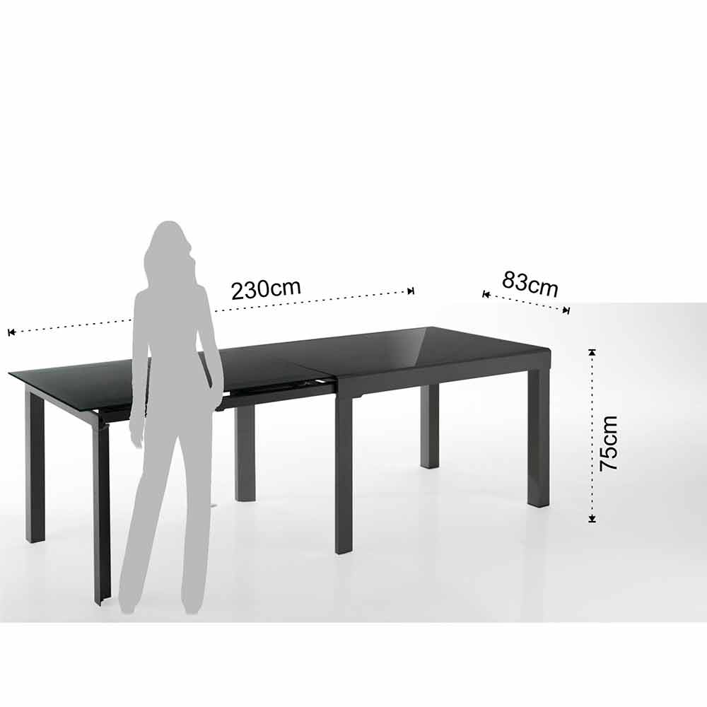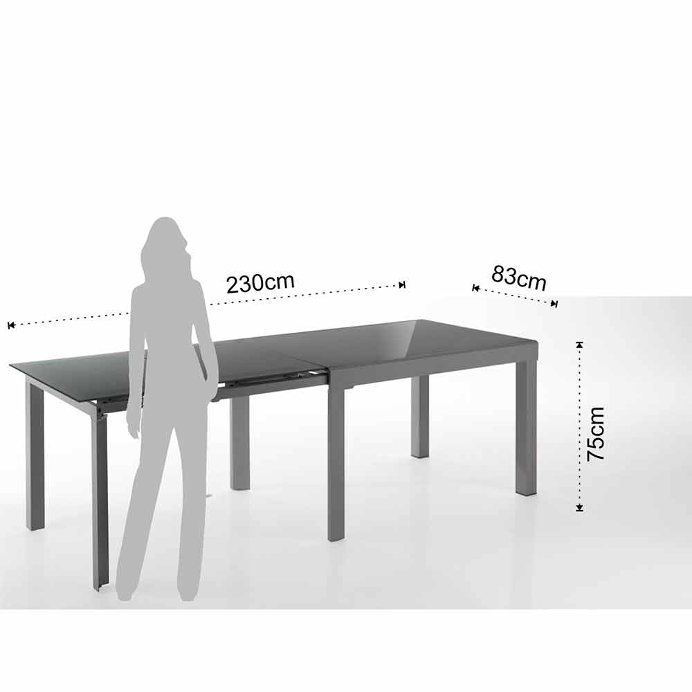 Guerriero is a practical and exuberant extendable dining table made with a tempered glass top (8 mm thick) and a painted metal base , available in three different finishes: