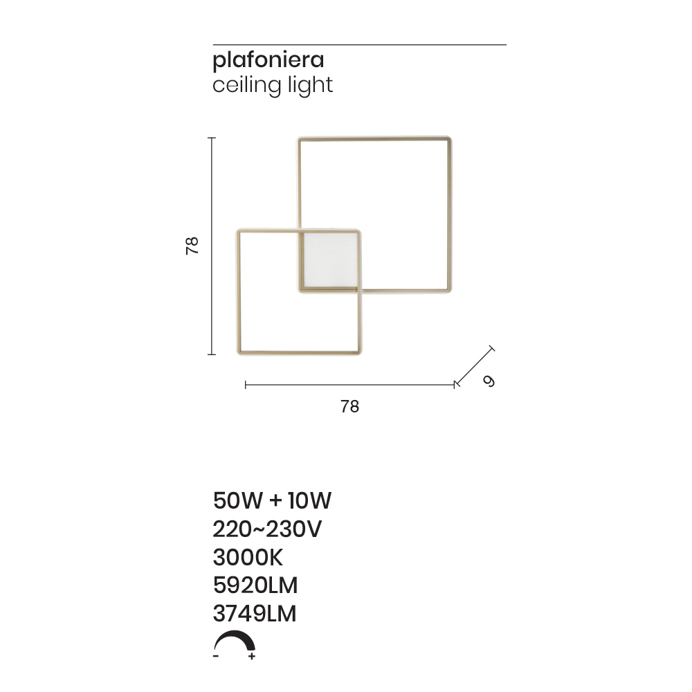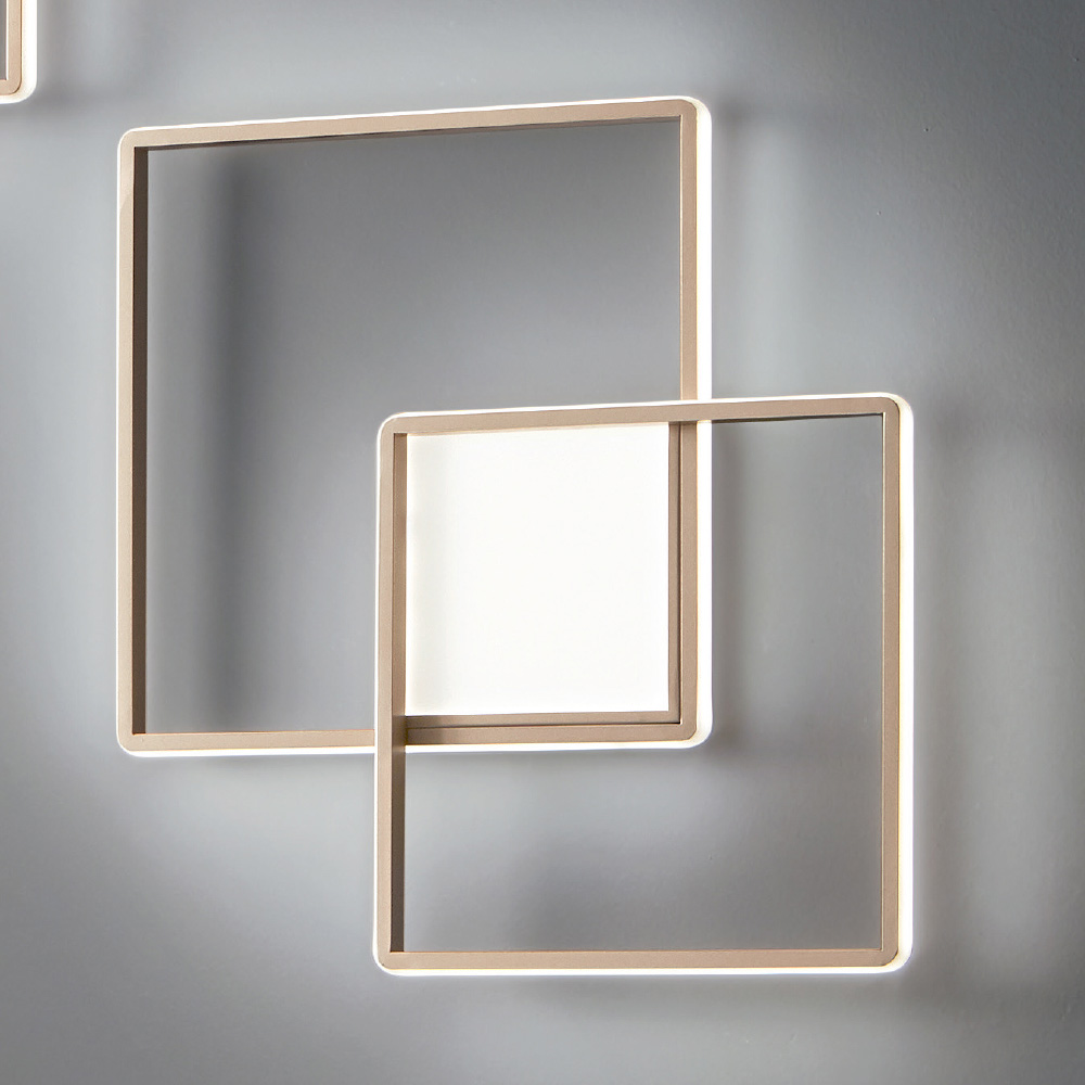 Wall light in gold finish painted metal complete with integrated dimmable LED source . A modern complement whose aesthetics are marked by simple shapes and original, squared lines , conceived and designed to illuminate and furnish domestic spaces such as entrances, corridors, bedrooms, living areas or kitchens in an exclusive and elegant way. The refined golden finish underlines its refined design and makes it a one-of-a-kind product for a result suitable for those seeking aesthetic perfection of geometric shapes even in their home furnishings. Its shape also makes it installable on the ceiling , becoming a real ceiling light and thus increasing its functional side and versatility.
