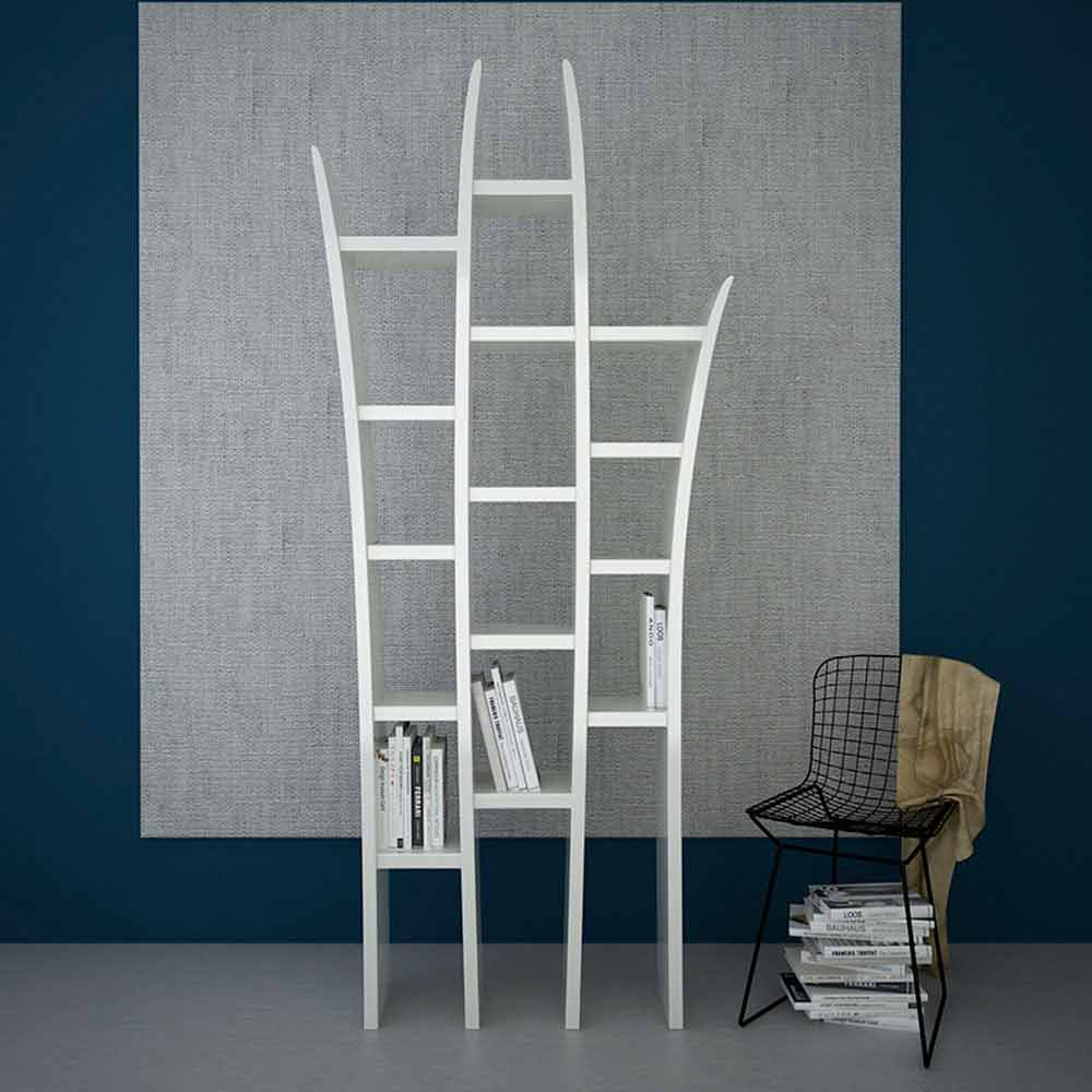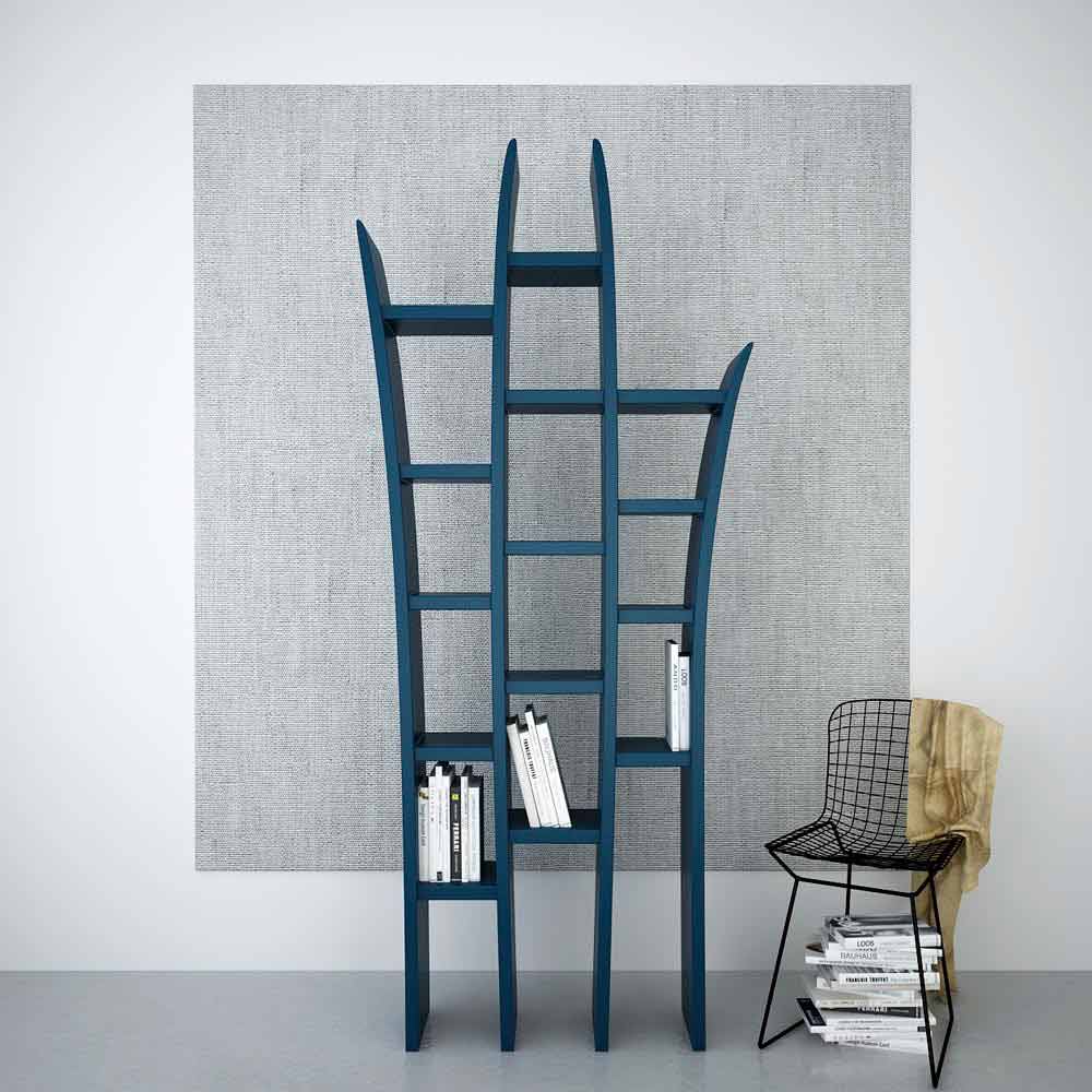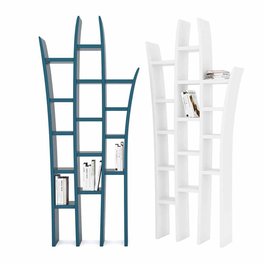 "Herba" bookcase, as its name suggests, is inspired by the movement of grass in nature. Each vertical part has been designed with a slight curvature and a thin tip, in order to represent its appearance in a real way. Made with Solid Surface ;, available in two color variants: White (RAL9003) or Ocean blue (RAL5020).