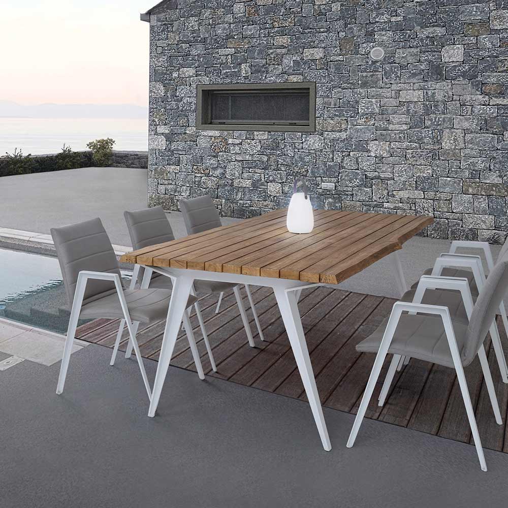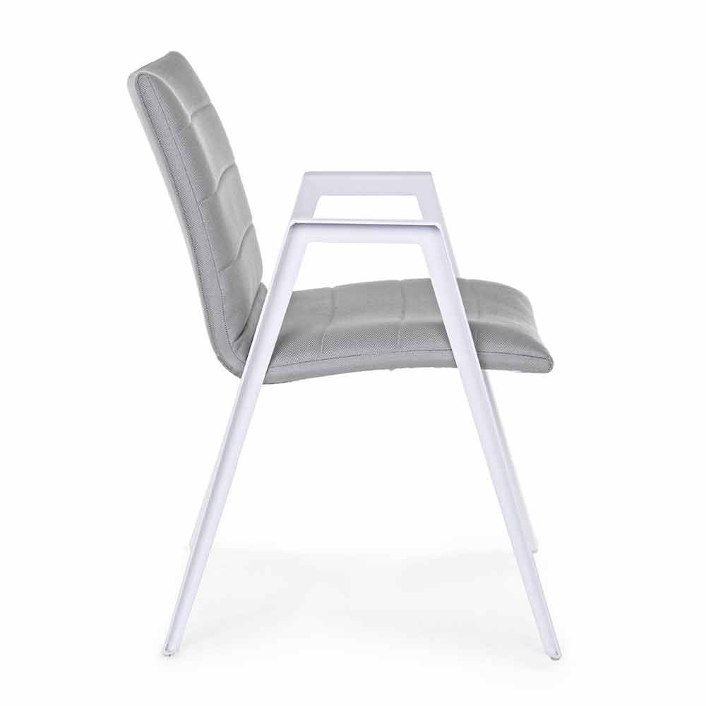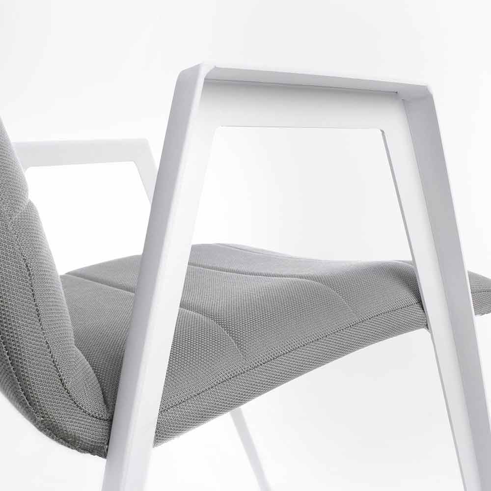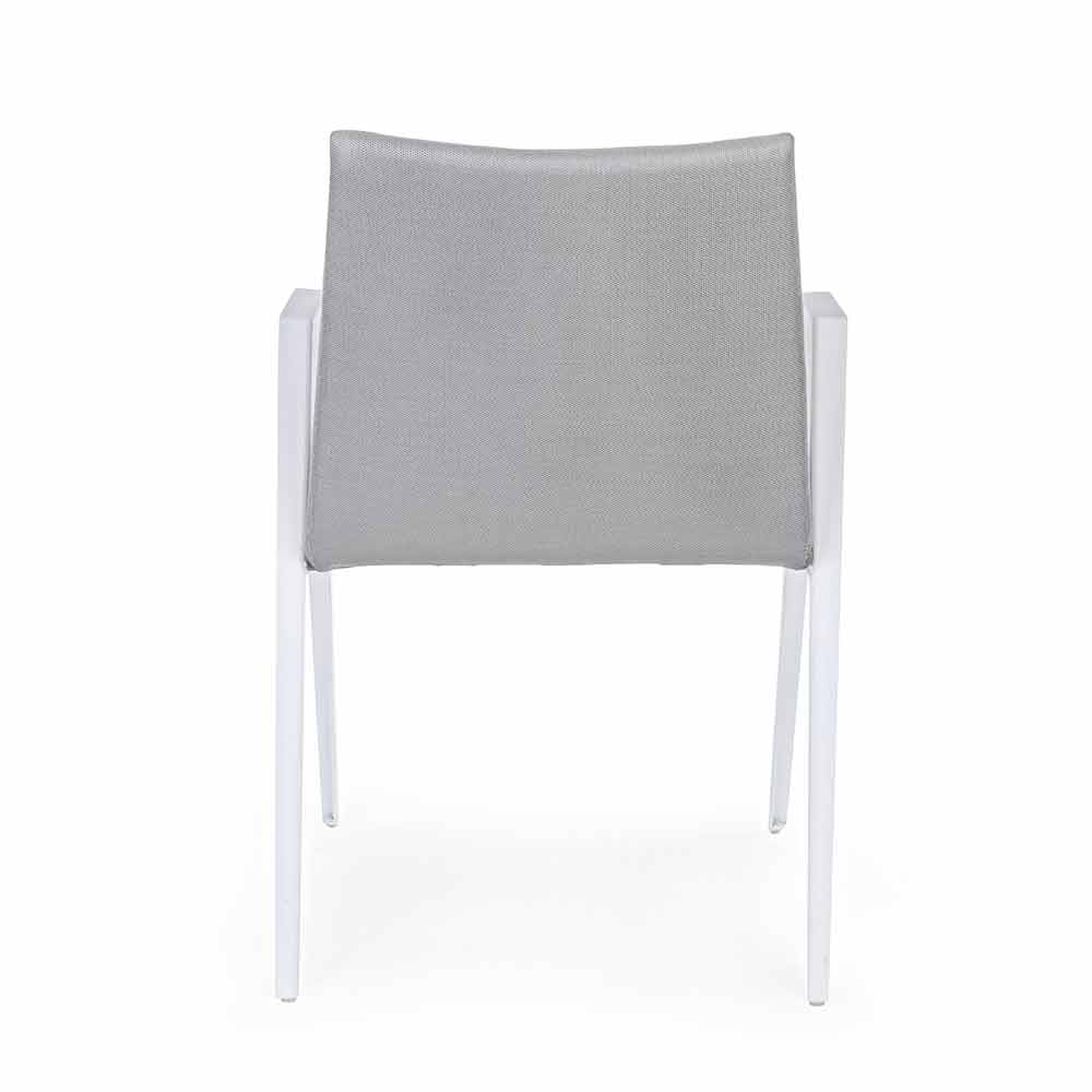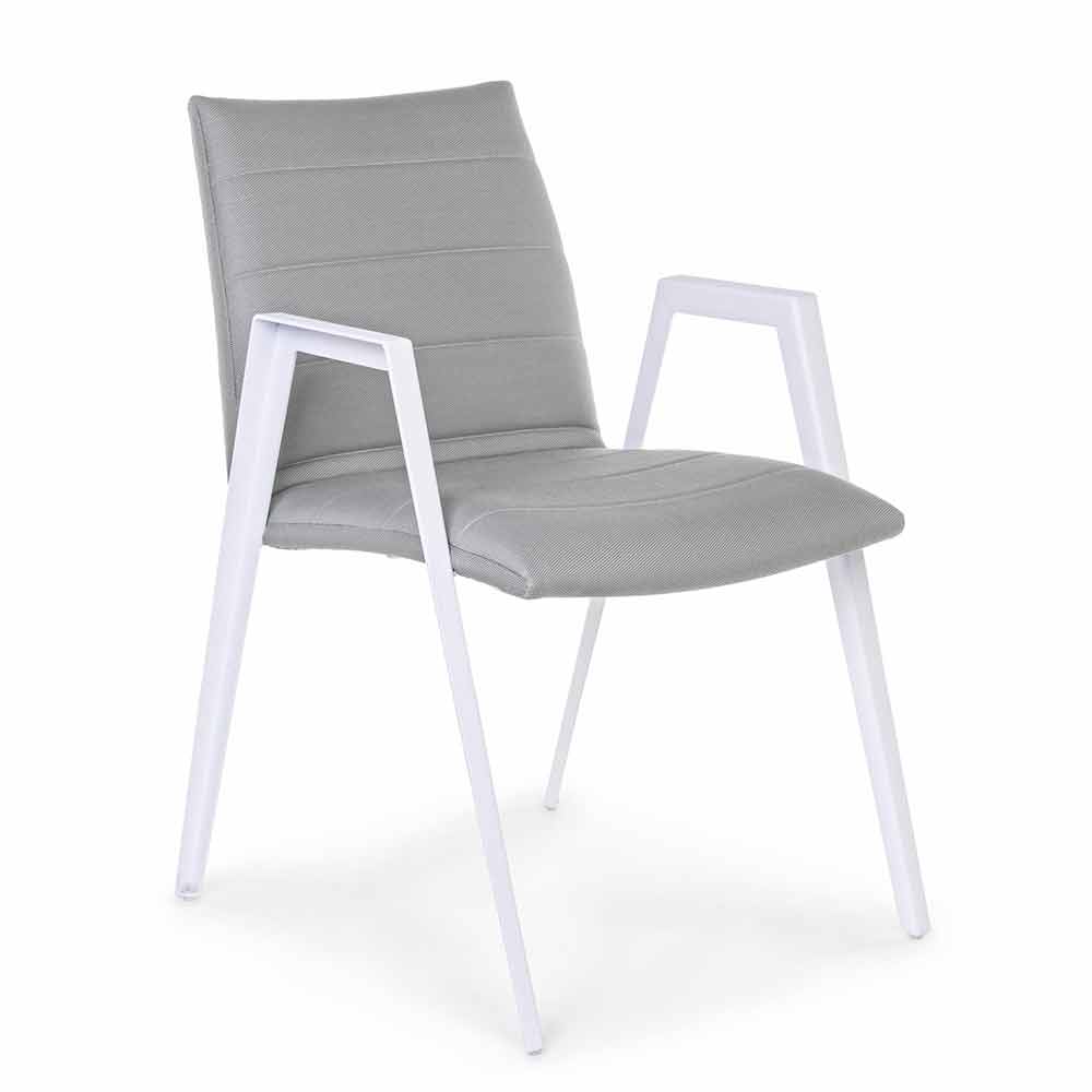 Modern outdoor chair with armrests, legs in white aluminum and seat and back in gray textilene.
