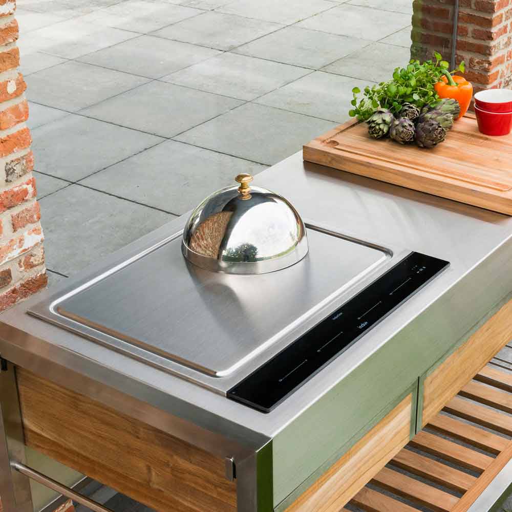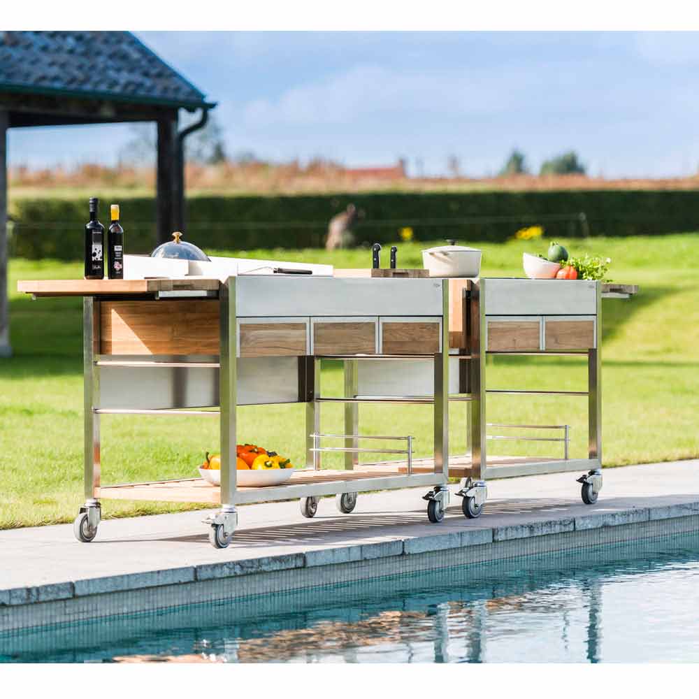 It is an outdoor kitchen on wheels characterized by a sturdy structure that uses brushed stainless steel and solid Teak wood, which you can place wherever you like: in the garden, on the terrace or by the pool, for a luxurious and trendy effect.