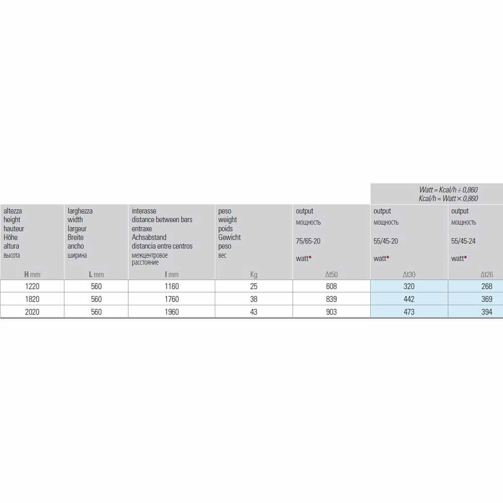 - H 1820 x L 560 x Inter. 1760 mm x Output w (Δt50 *) 839; Yield w (Δt30 *) 442; Yield w (Δt26 *) 369