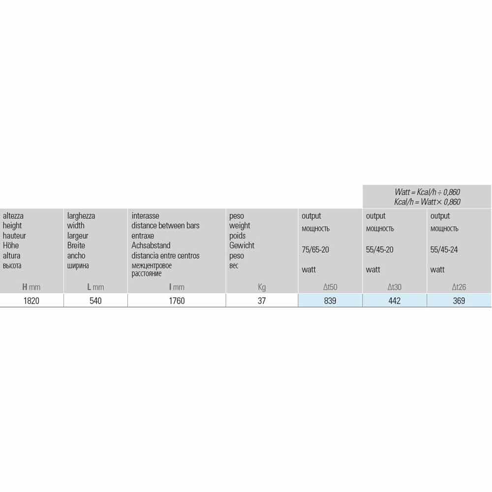 Measures H 1820 x L 540 x Inter. 1760 mm x Output Δt50 839 w, Δt30 442 w, Δt26 369 w