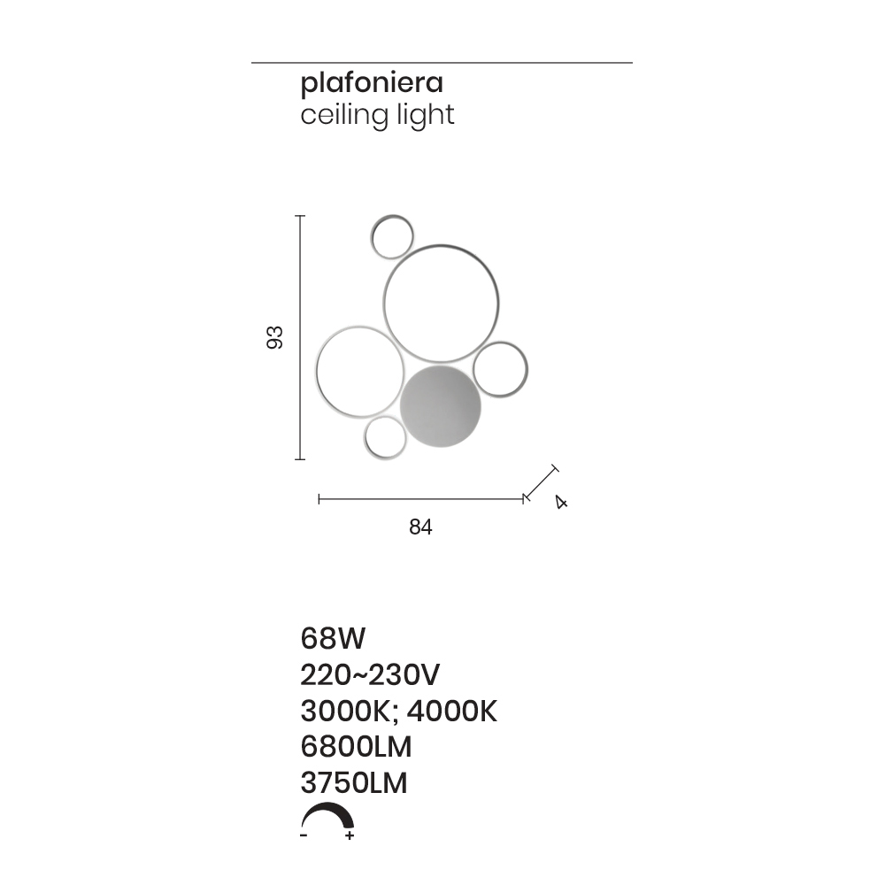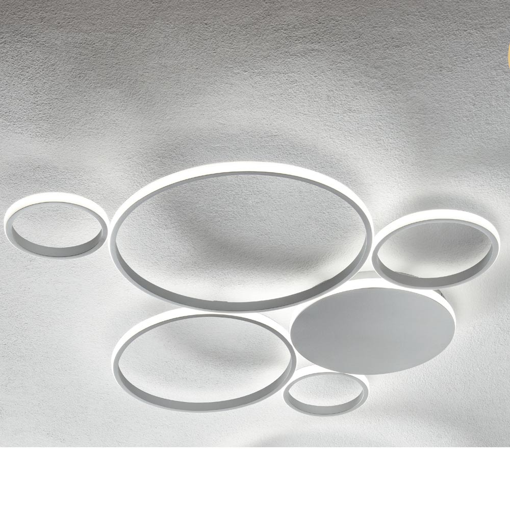 Wall lamp with structure made of painted metal complete with dimmable LED source . An original composition made up of circles of different sizes joined together and covered on the outside by a milky white diffuser that encloses the LED strip, creating wonderful light effects on the walls for a result with a strong scenographic effect . Thanks to its creative personality and its modern soul, it will be able to offer both quality lighting and a unique decorative element capable of enriching the walls of your home with an exclusive touch . A furnishing accessory with a versatile character , which can be installed in any domestic environment such as the entrance, the kitchen, the living area or the bedroom. Its shape also allows it to be installed on the ceiling like a classic ceiling light, making it even more eclectic.