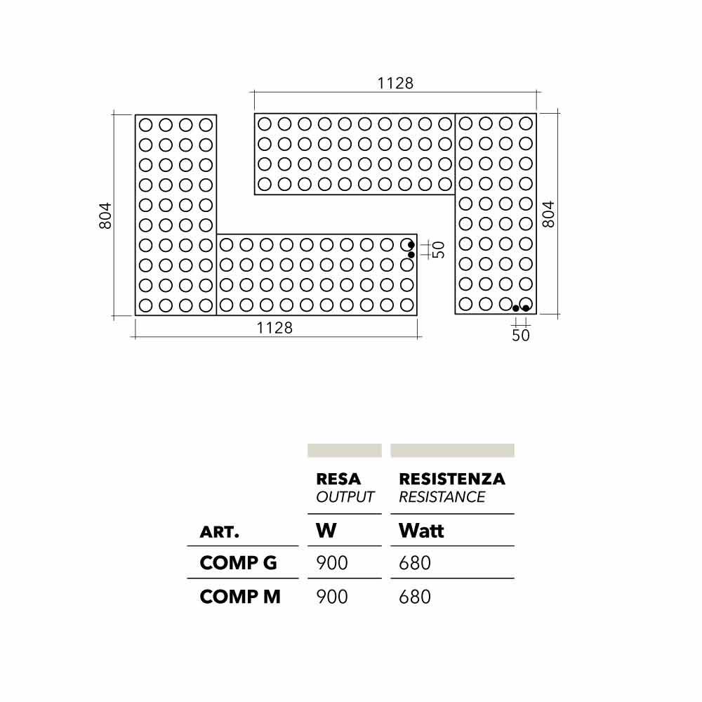 Measures Dimensions for each element: 1128 x 804 mm, 50 mm centre distance; 680 Watt electrical resistance