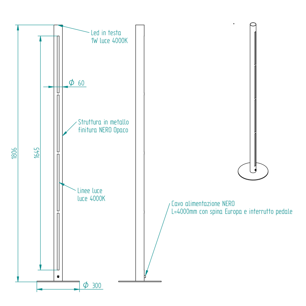 This floor lamp is made entirely of metal and is equipped with double vertical lighting and a light point in the upper part.
