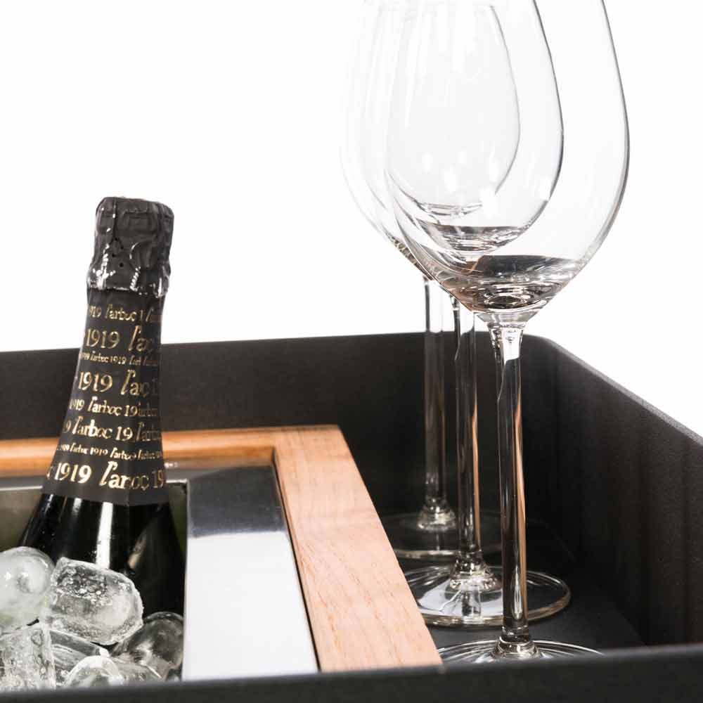Bring this mobile bar on wheels wherever you go, to keep drinks always fresh and close at hand! It can be used with or without ice cubes and no electrical connection is required. In fact, it keeps drinks and food cool thanks to the double chamber cooling container with lid. It is a multifunctional product: bar / table for indoor and outdoor use.