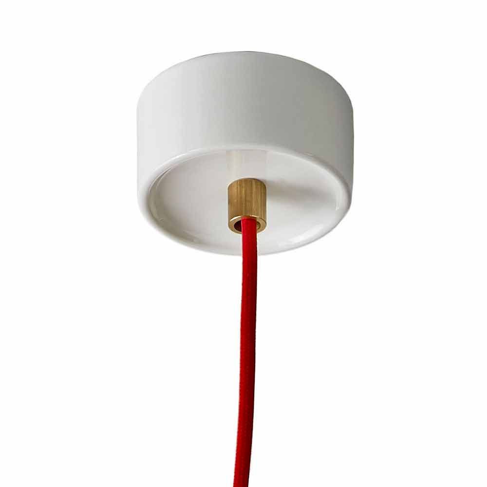 Pendant lamp in modern white ceramic made in Italy Asia Colored suspension lamp in white ceramic and beech wood with red cloth cable and brass cable clamp.