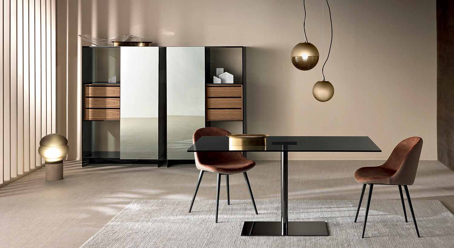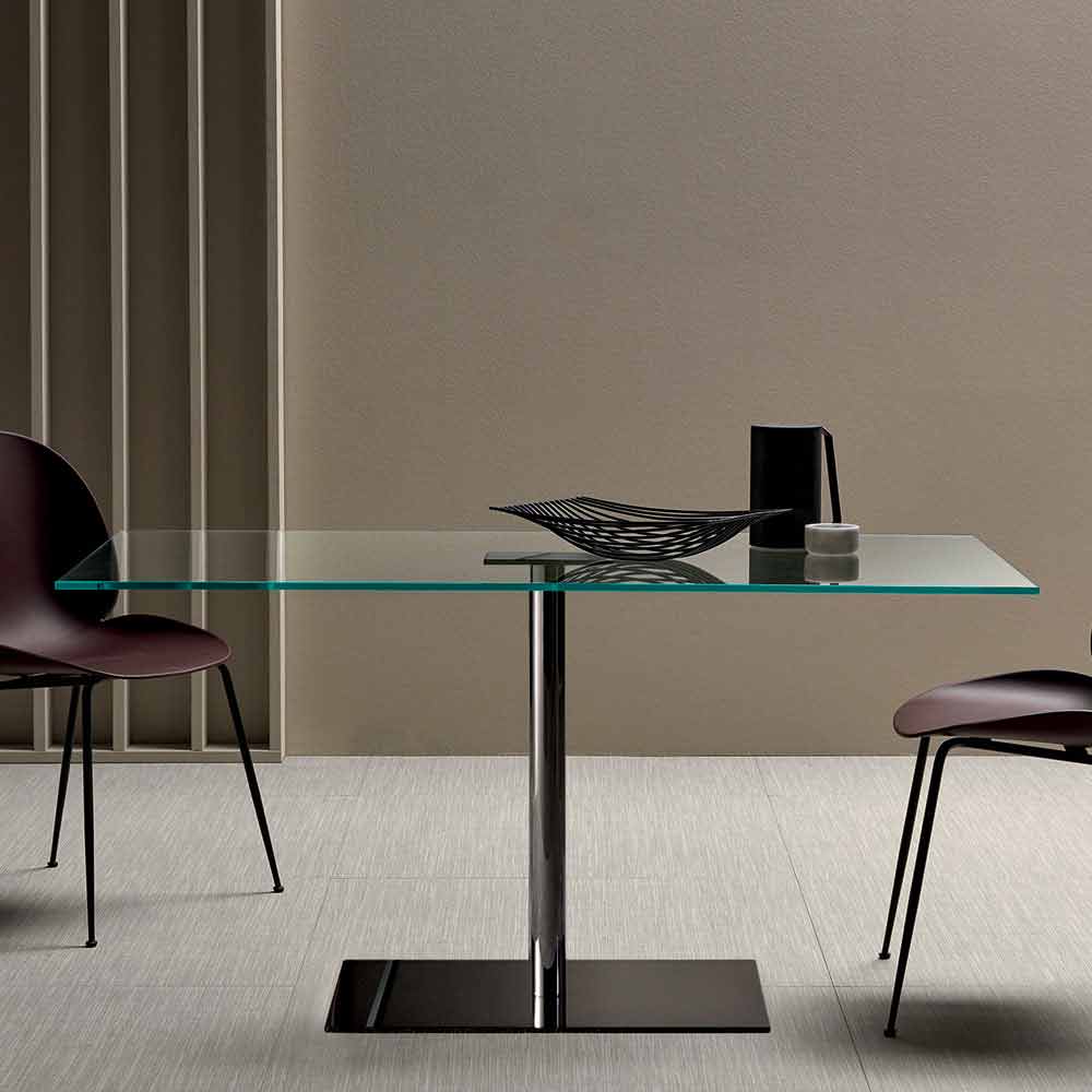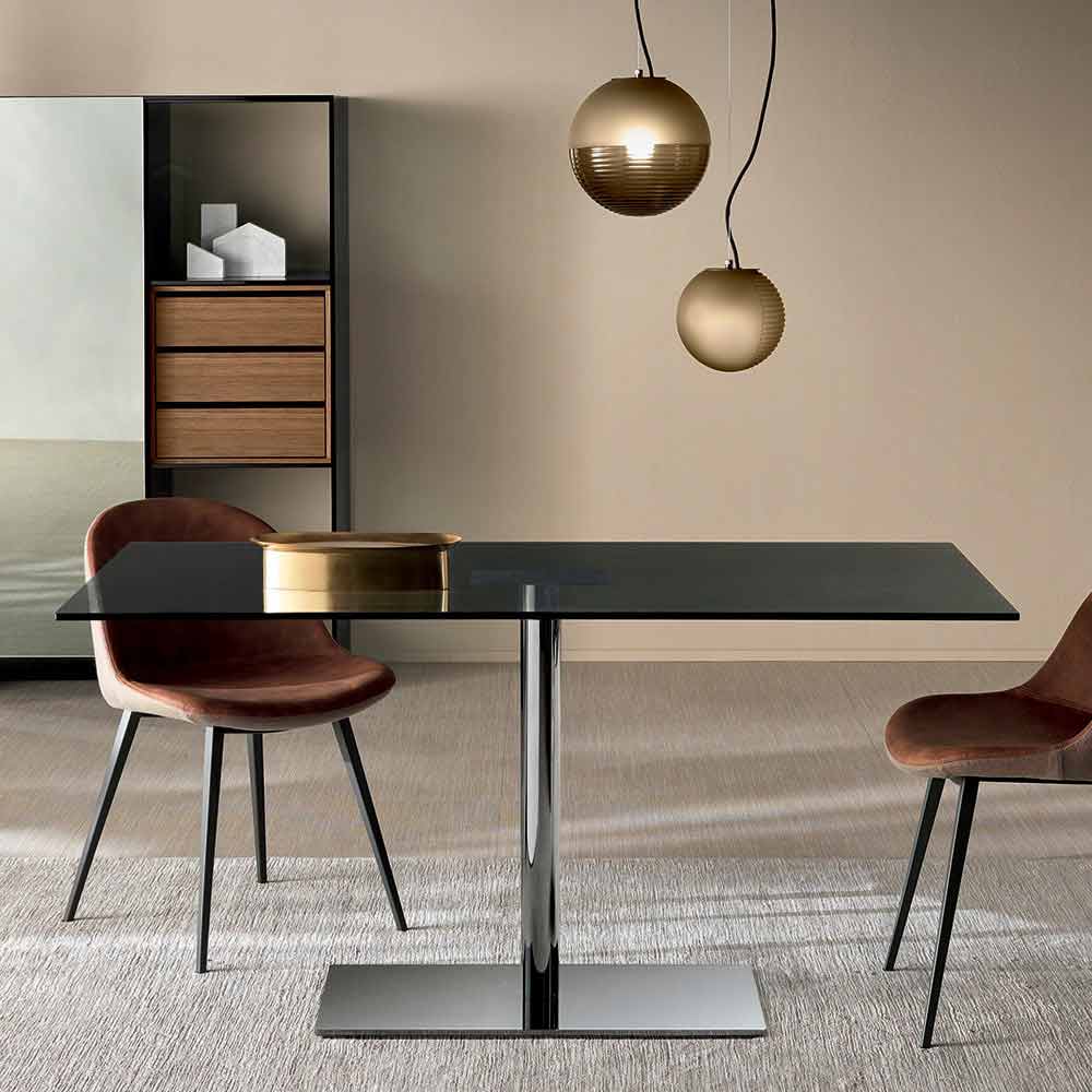 Luxury rectangular dining table with extra-clear or smoked glass top and metal base, made in Italy.