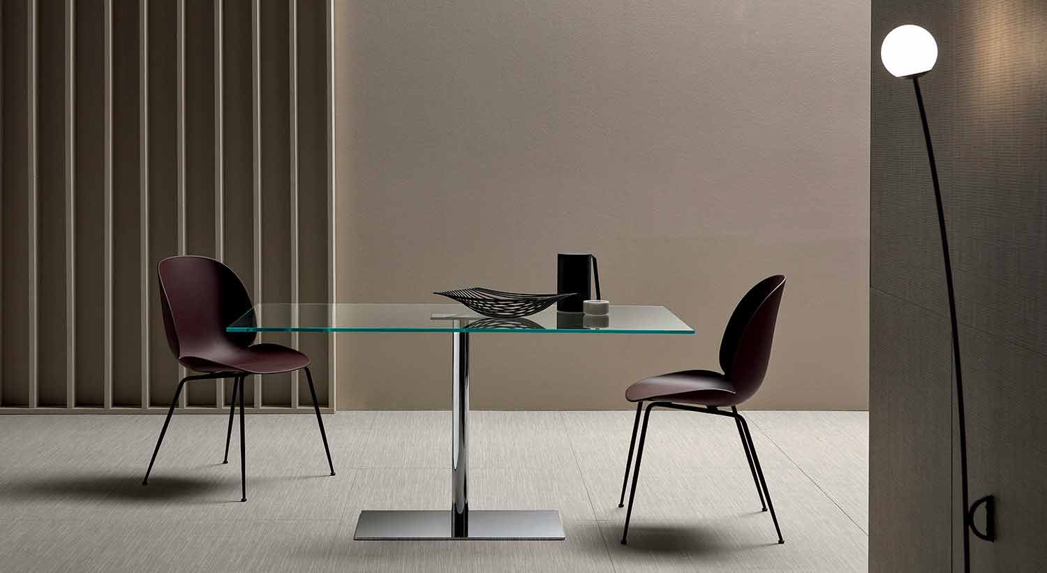 extra-clear glass top, chromed metal base.