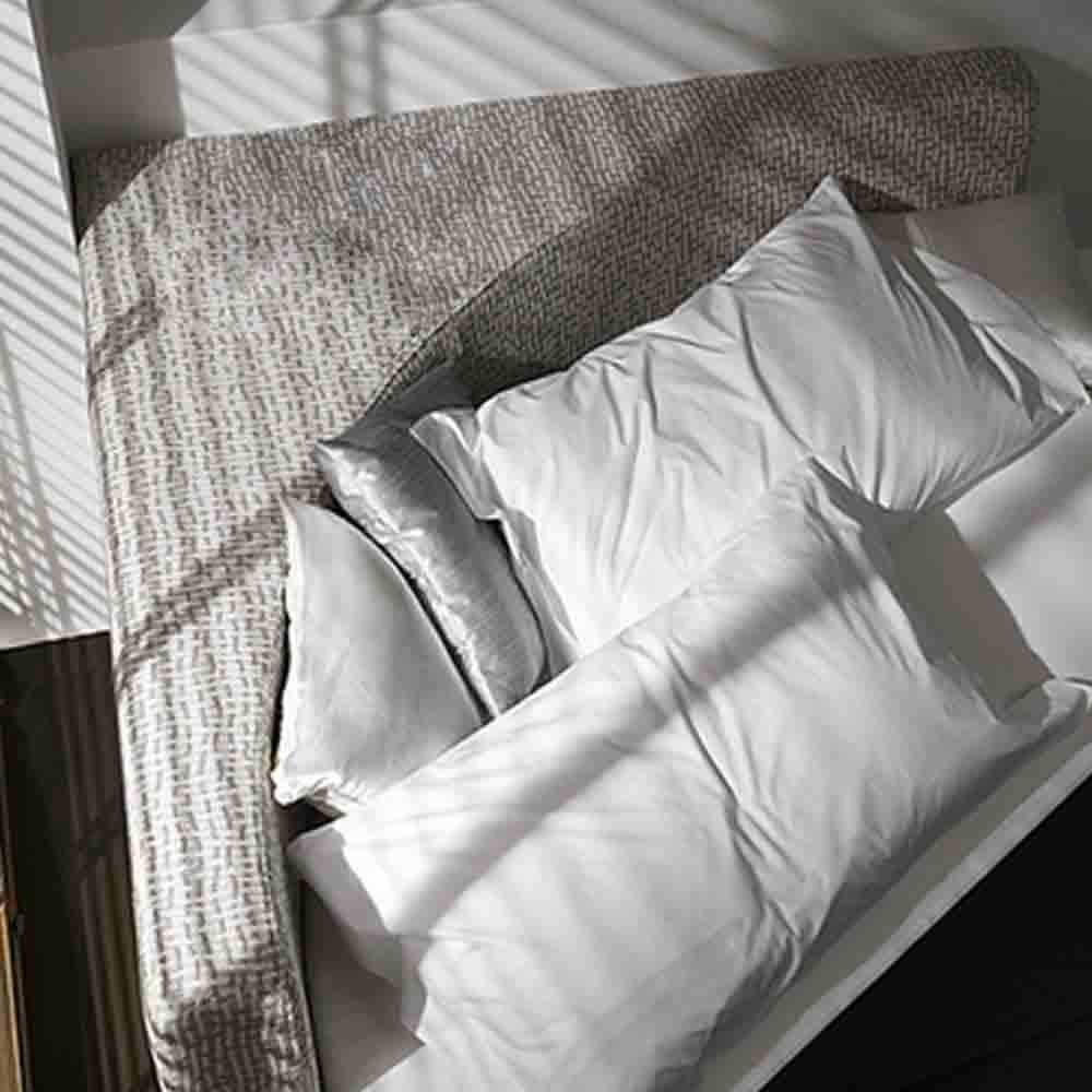 Round double bed with a unique and refined design characterized by the angular shape of the headboard that allows it to be used both in the center and in the corner of the room. It is in fact finished on all sides.