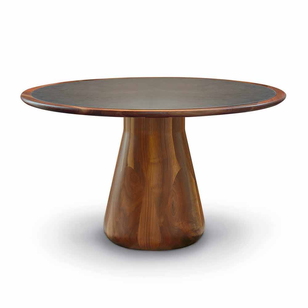 Fixed round table with solid walnut top. Base in solid turned Canaletto walnut. Carlo has clean features and lines that manage to enhance his value. Made of natural walnut and finished in oil, it shows the particular stylistic refinement with the shape of the base and the top covered in eco-leather.
