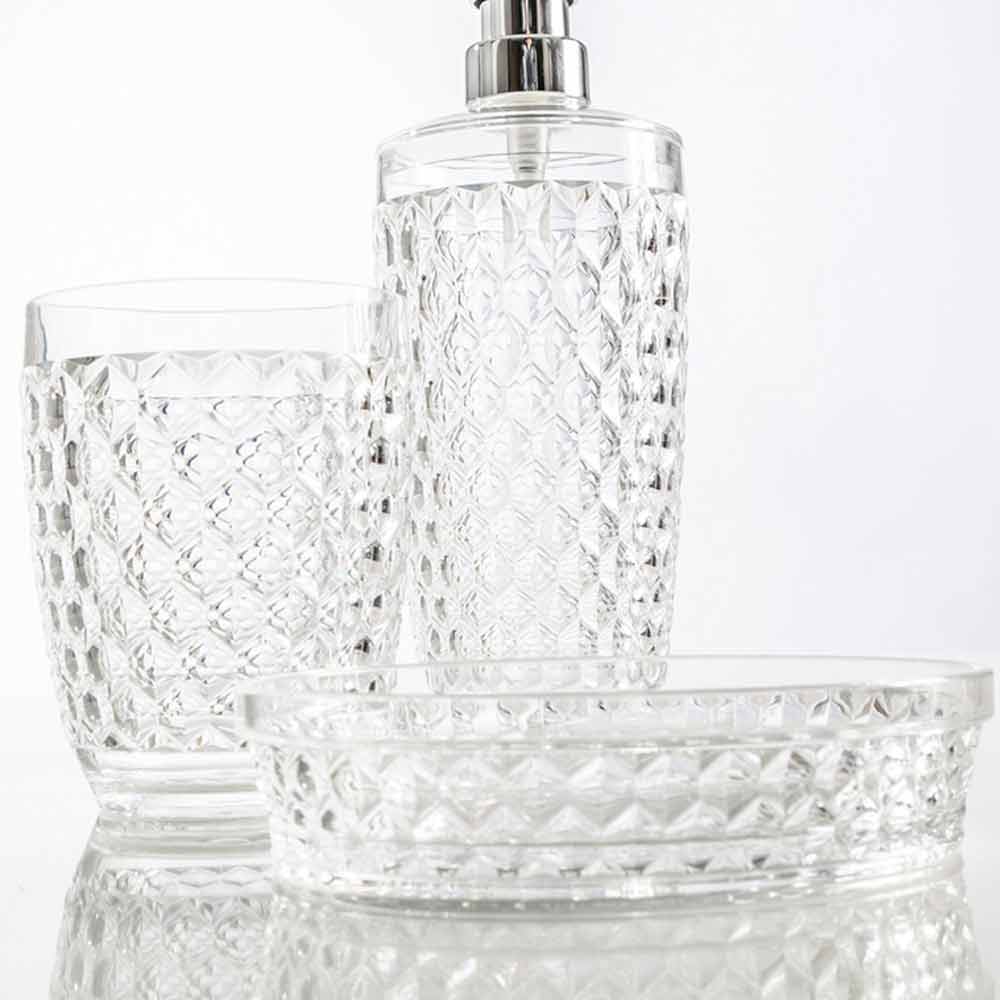 The set consists of: - 1 dispenser diam. 8x22cm; - 1 glass diam.8x12cm; - 1 soap dish 13x10x3cm.