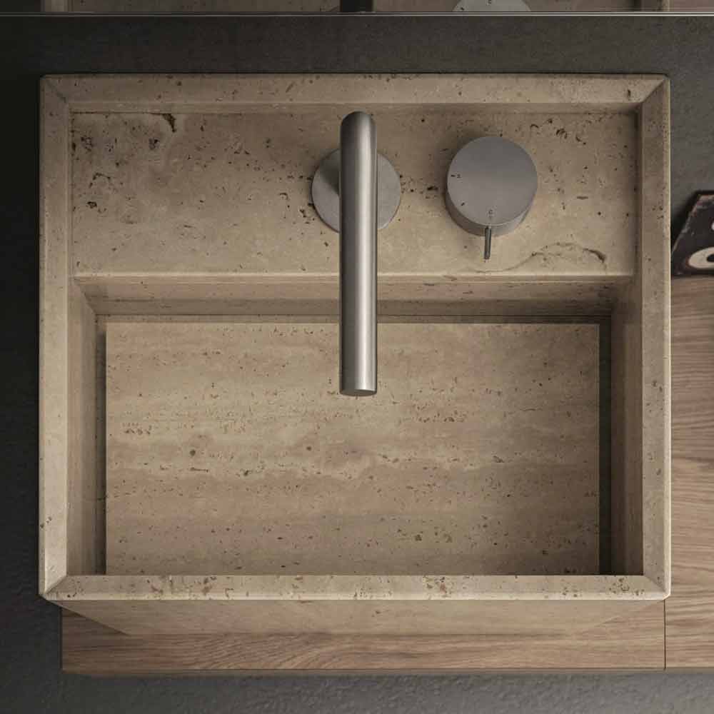 Square countertop washbasin, modern design in natural stone, without drain hole with tap hole.
