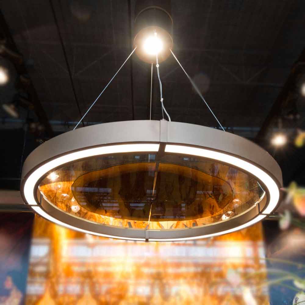 Modern chandelierwith bronze finish steel structure with a circular shape inside which we find a coupled glass plate finished with an insert in canaletto walnut wood . Made in Italy through the use of quality raw materials , this complement offers an original and captivating idea of lighting that embodies elegance and contemporaneity. Its peculiarity is represented by the wonderful combination of selected colors and finishes that bring to life a real work of art capable of revolutionizing any area of the house thanks to the encounter between the modernity of metal, the timeless elegance of glass and wonderful colors of the wood and its grain. The shape and dimensions that underline its aesthetics make it a perfect solution to illuminate large spaces such as dining rooms or living rooms where it completes the furniture with a refined and innovative touch, while creating a splendid warm and welcoming atmosphere .