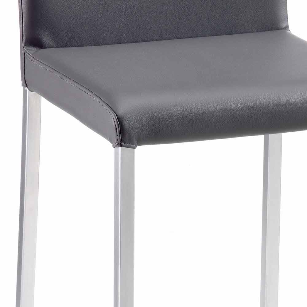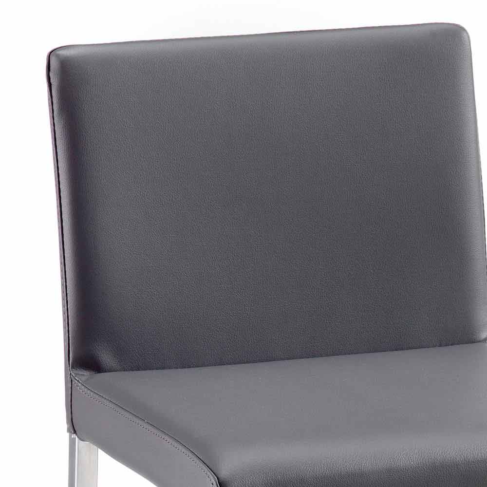 Not stackable. The legs have a geometric and square shape, with a satin finish. The seat is covered in anthracite-colored eco-leather.