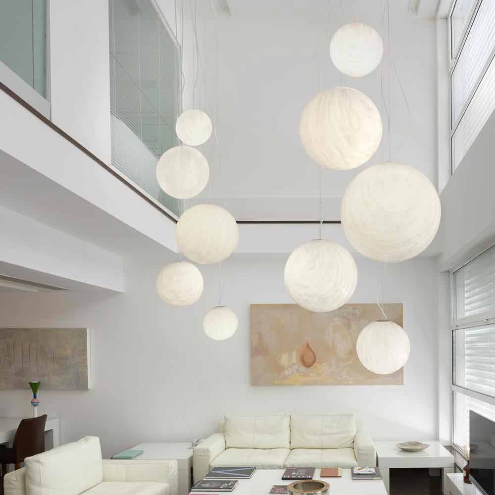 It can be used both as a single chandelier and as a composition of spheres of different sizes to transform it into a large modular luminous fulcrum with a rosette for five Mineral lamps, which can be sold separately.