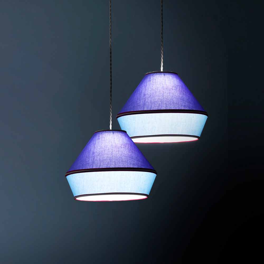 Made entirely in Italy , this suspended lamp is composed of a blue and lightblue cotton lampshade enriched with red and white inserts that increase its aesthetic value, making it unique and with an original design . Precisely this creative combination is able to give a touch of color and liveliness to the environment, making itself noticed thanks to its strong personality and at the same time managing to revolutionize the appearance of the room in an unmistakable way.