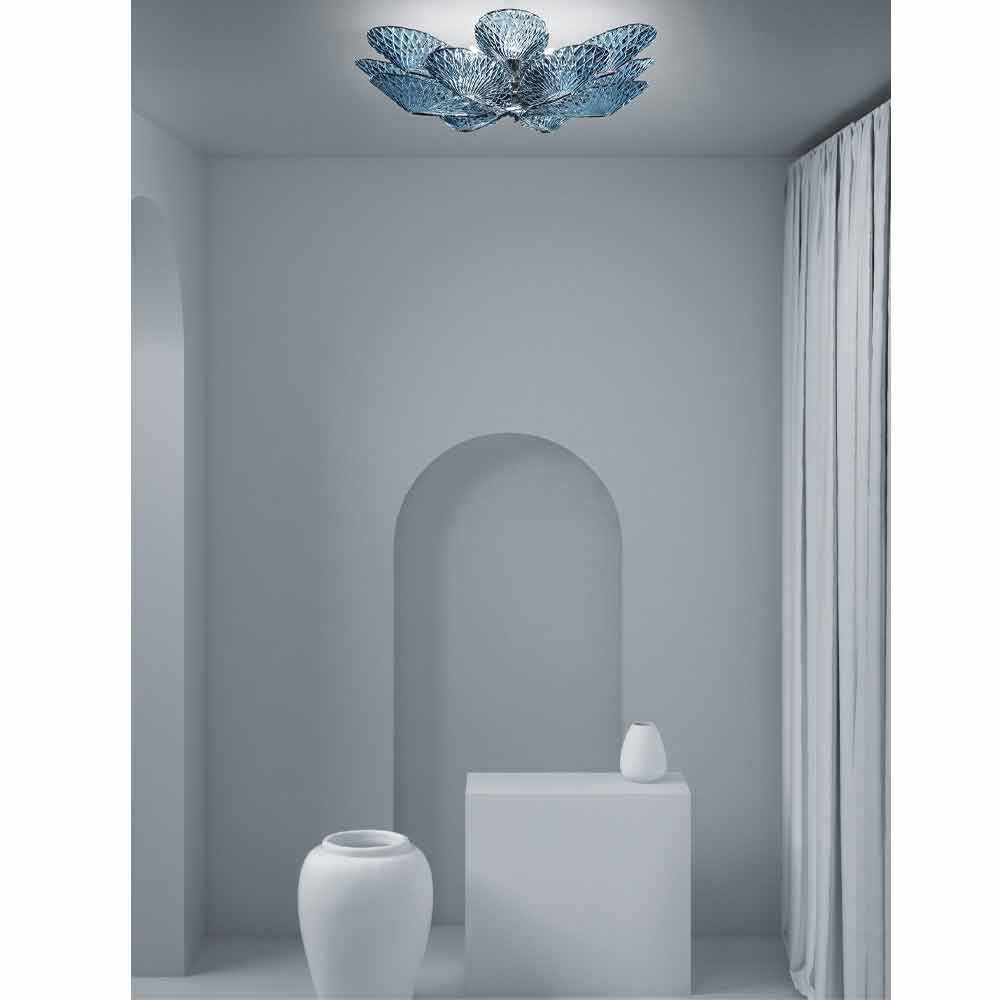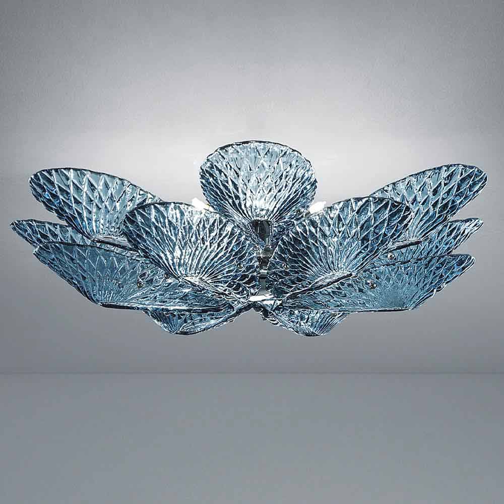 Refined ceiling lamp handcrafted in Italy in Venice in blue colored glass with details in polished chromed metal . Delicate and elegant glass ribbons come together to give life to a luminous fulcrum capable of combining with contemporary spaces and giving character to the most classic environments. A versatile furnishing solution characterized by the particular diamond pattern that covers the entire surface, creating multiple flashes for unusual and exclusive plays of light.