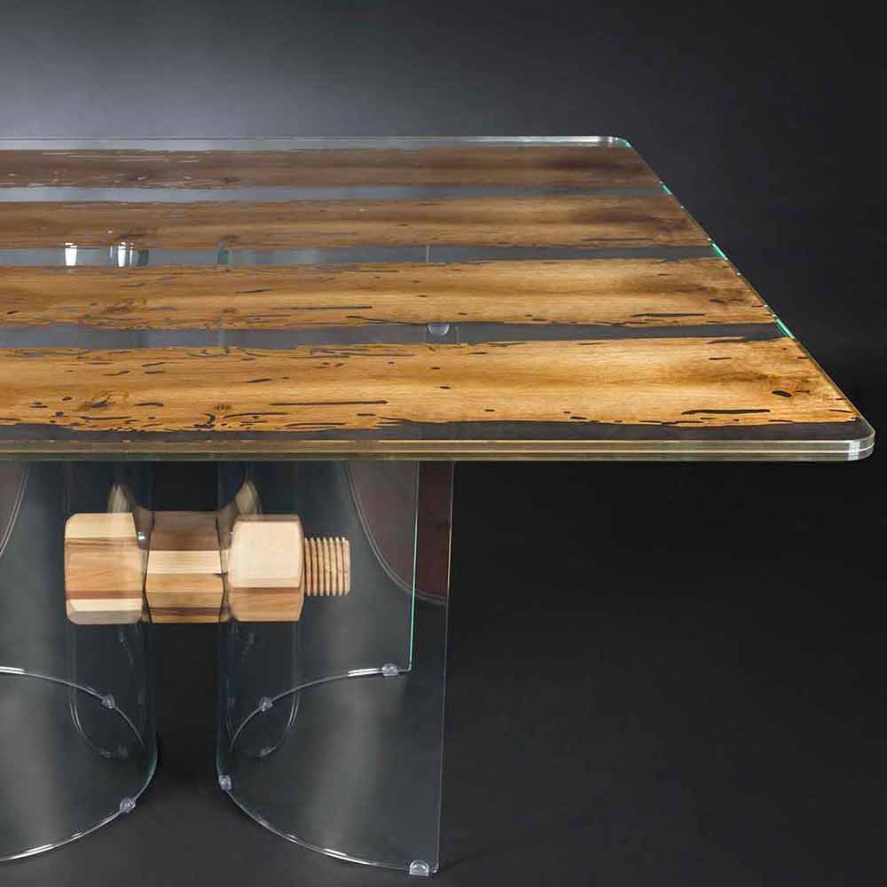 Venezia is a unique and extraordinary table, which encloses the history of Venice. Venezia is made from Briccola wood: "Briccole" are the posts standing in the lagoon of the city of Venice from immemorial time, that guide boats and alert. The table top is made of two layers of glass (10+10 mm). Between one layer and another, you will find a thin layer of aged briccola wood. The legs are made from curved glass.