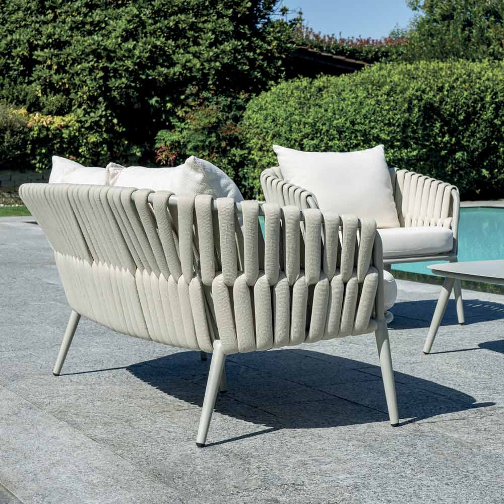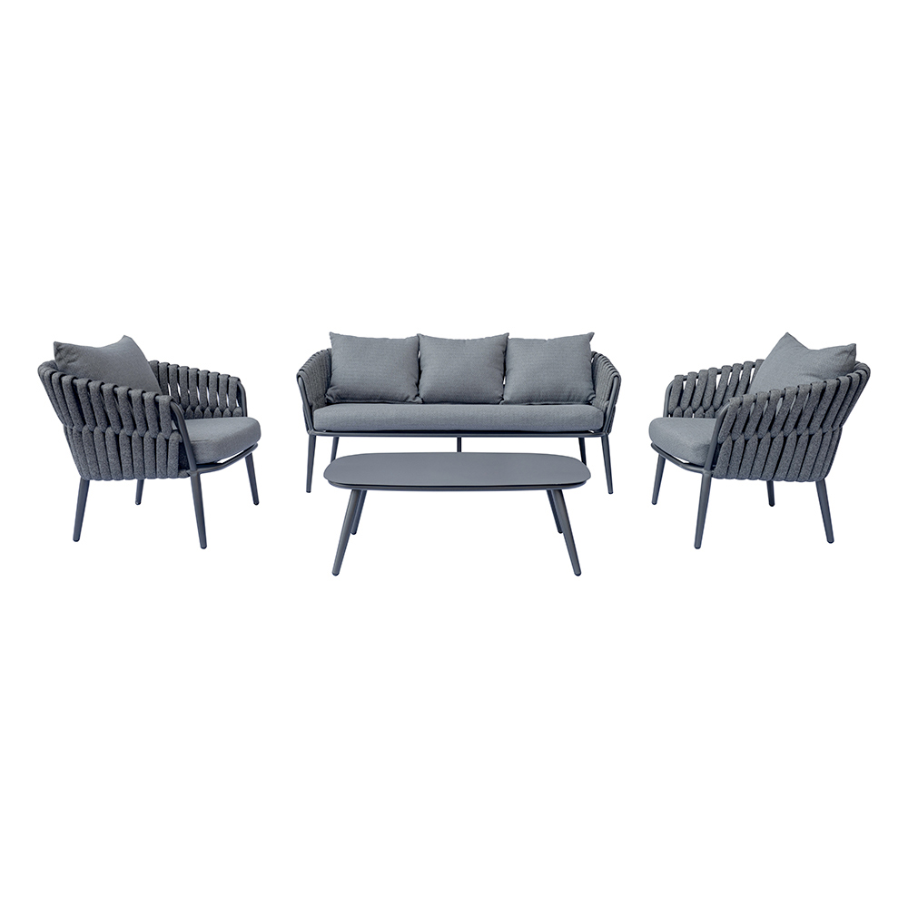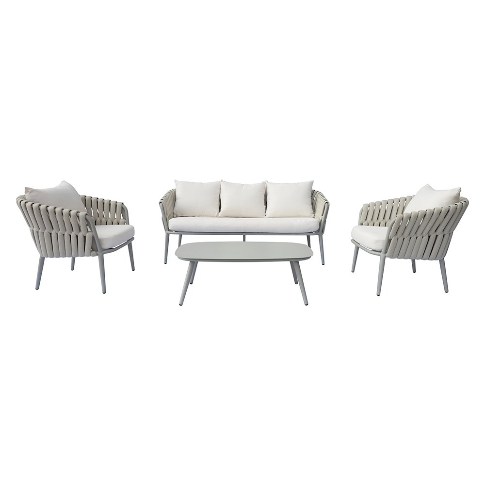 The aluminum frame ensures lightness and durability, while padded rope wraps around the seats and backrests, lending a contemporary yet comfortable touch. The removable cushion covers ensure practicality and easy cleaning, maintaining the elegant and refined look of the living room over time.