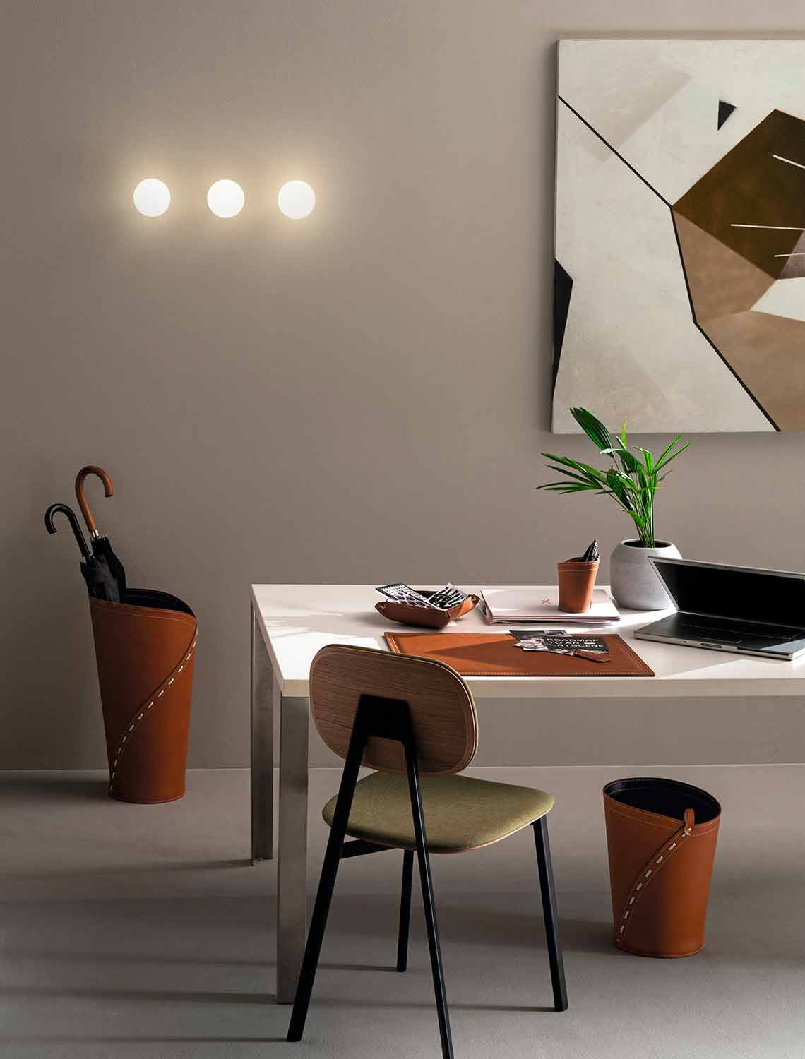 The set of Giulio office accessories includes functional but at the same time decorative complements. They are produced in regenerated leather in Italy by skilled artisans specialized in the processing of this material.