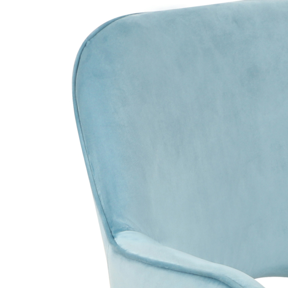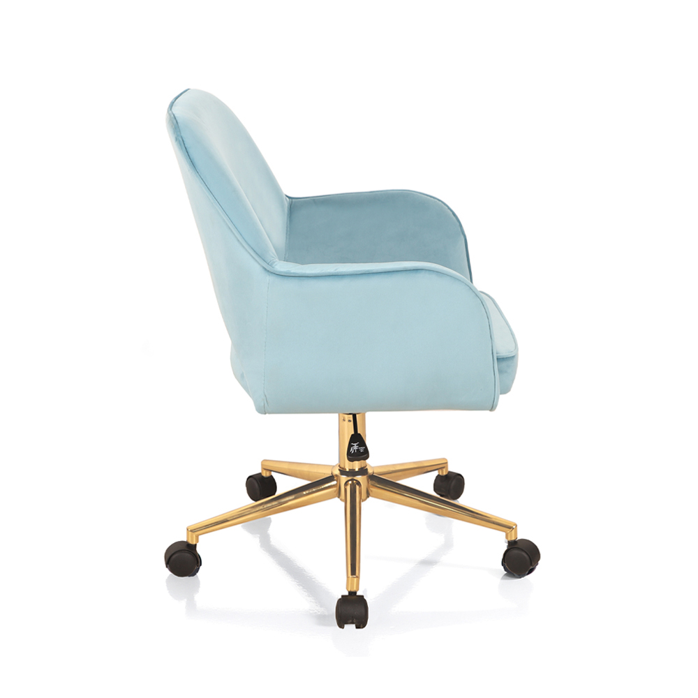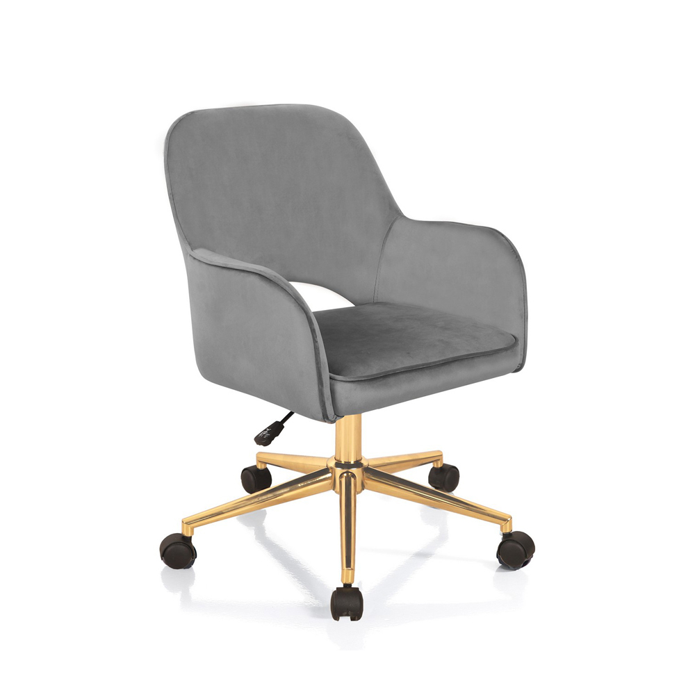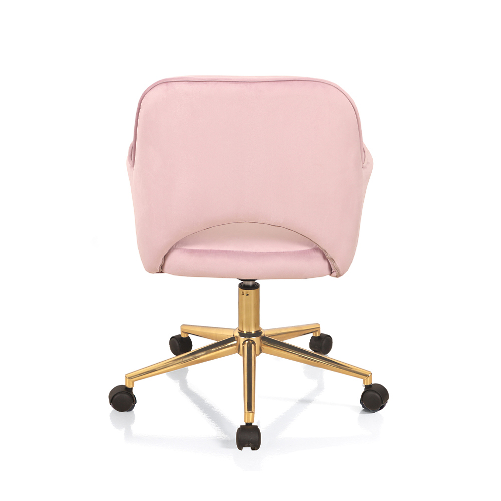 Armchair made with non-removable padded seat covered in soft velvet-effect microfibre fabric , star base in shiny gold painted metal , height-adjustable gas lift and swivel wheels. This article guarantees a soft and enveloping seat, easy movement thanks to the wheels. It is perfect for use in work offices but also on home desks, giving the room a professional and modern atmosphere.