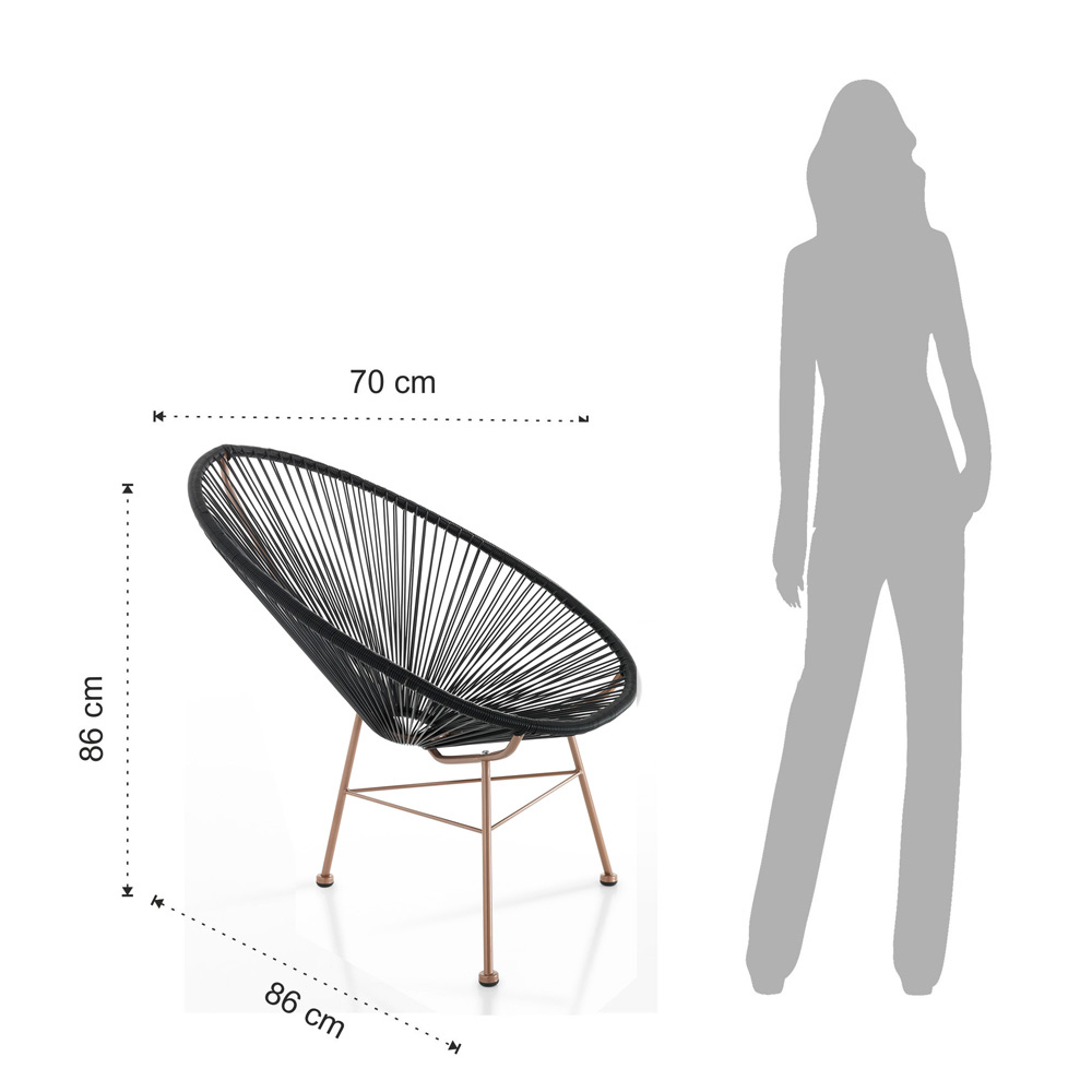 Armchair made with semi-gloss copper painted metal frame and black Polyrattan cord backrest. This furniture is perfect for treating yourself to unique moments of tranquility and relaxation. The materials chosen for the construction guarantee a comfortable and enveloping seat but also resistance and functionality to place the armchair both indoors and outdoors.