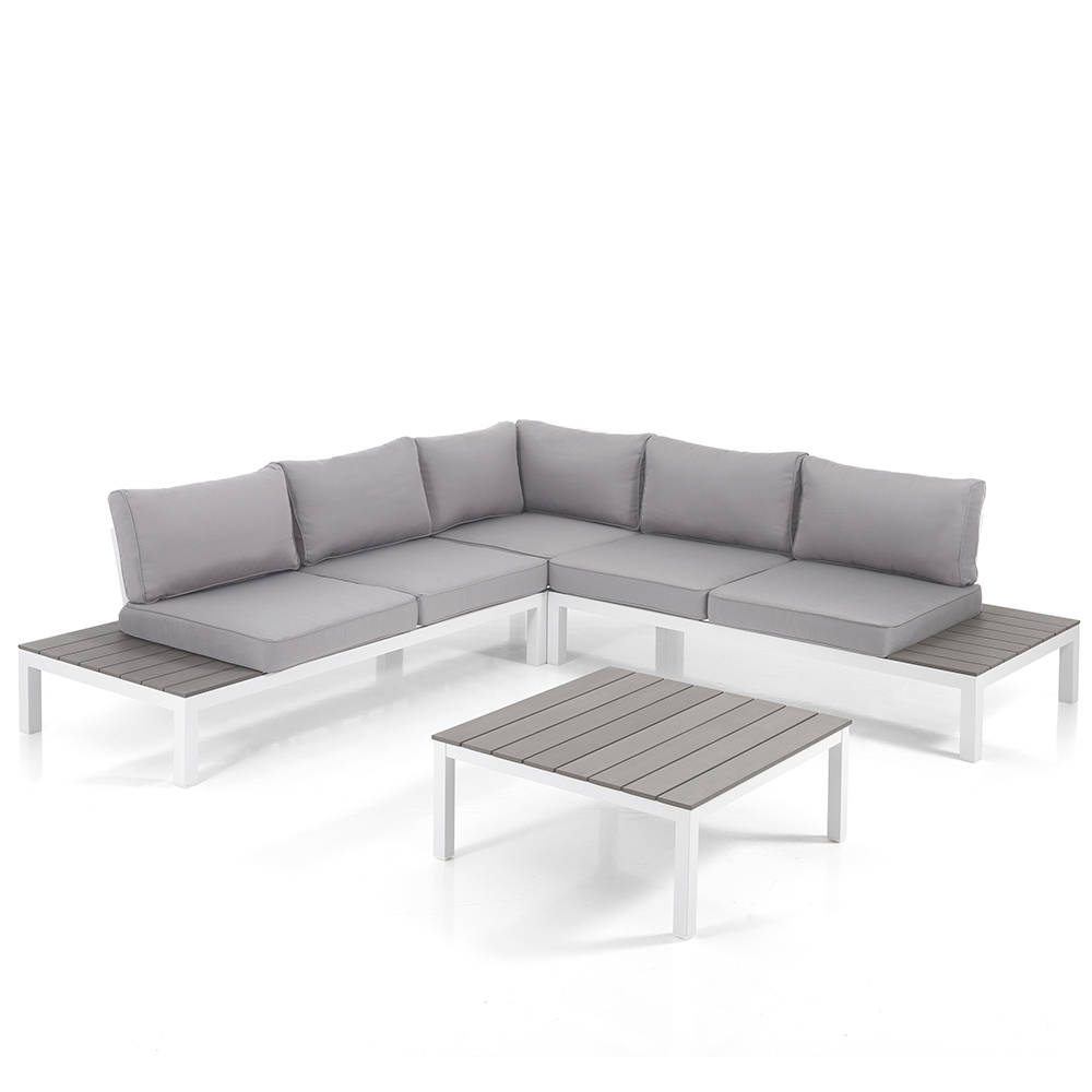 This corner sofa and garden table represents the quintessence of elegant relaxation and contemporary style. With its white frame and clean lines, the sofa offers a chic, modern contrast against the warm wood of the seating and table surface, creating a welcoming environment that is both inviting and aesthetically pleasing .