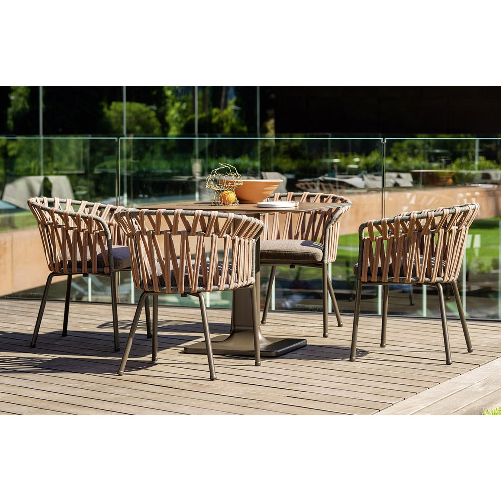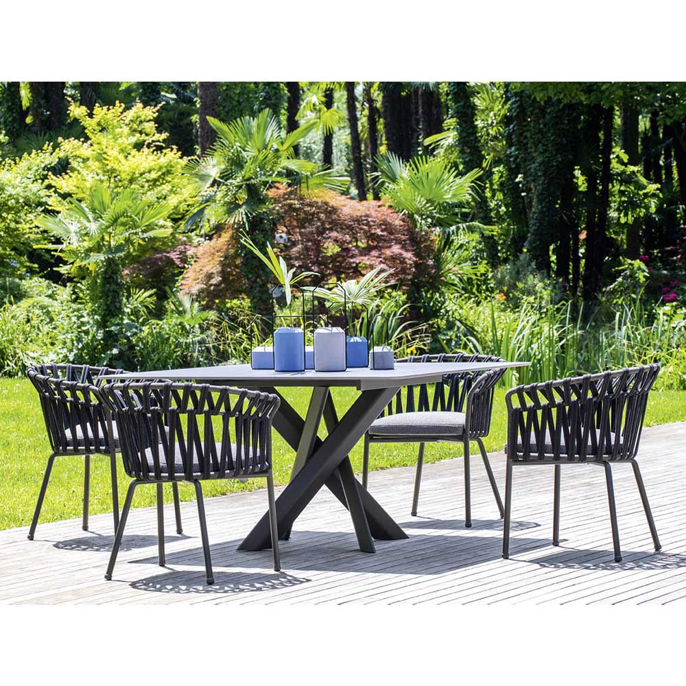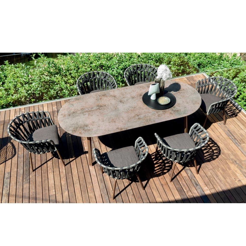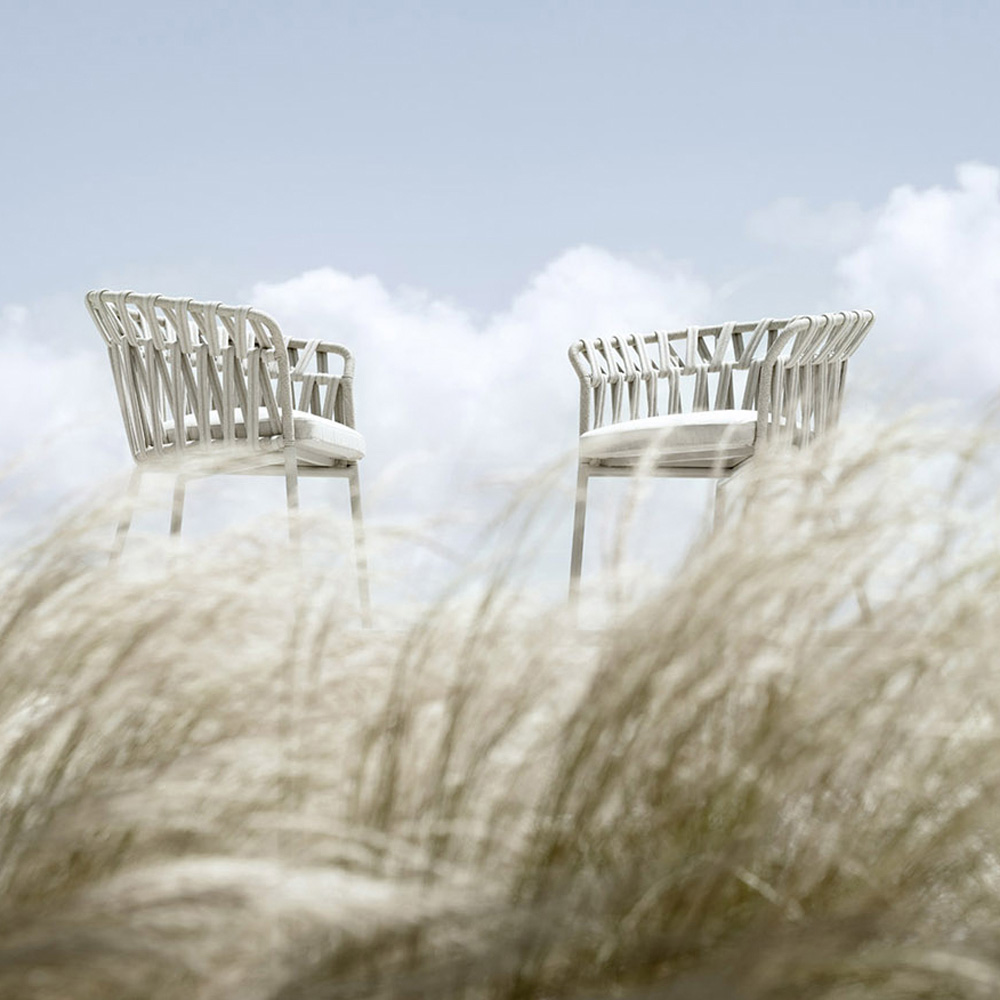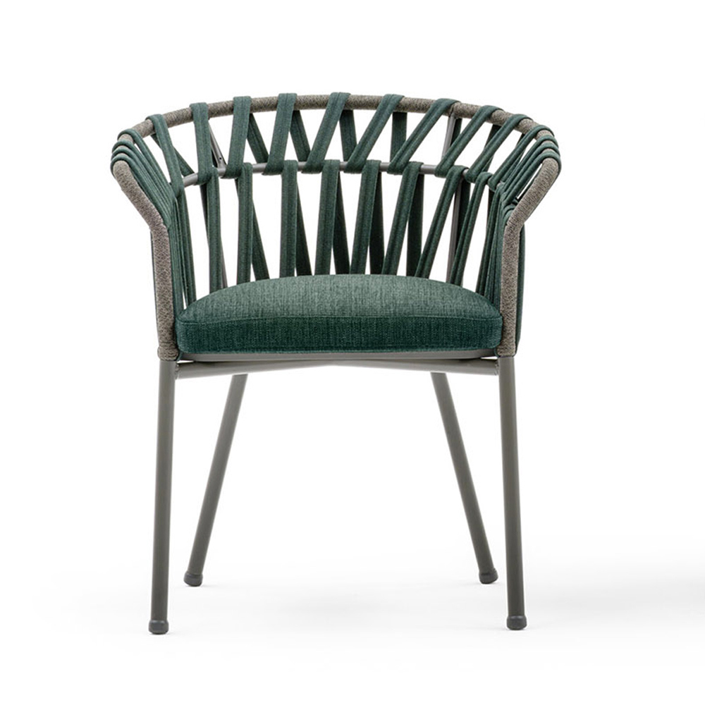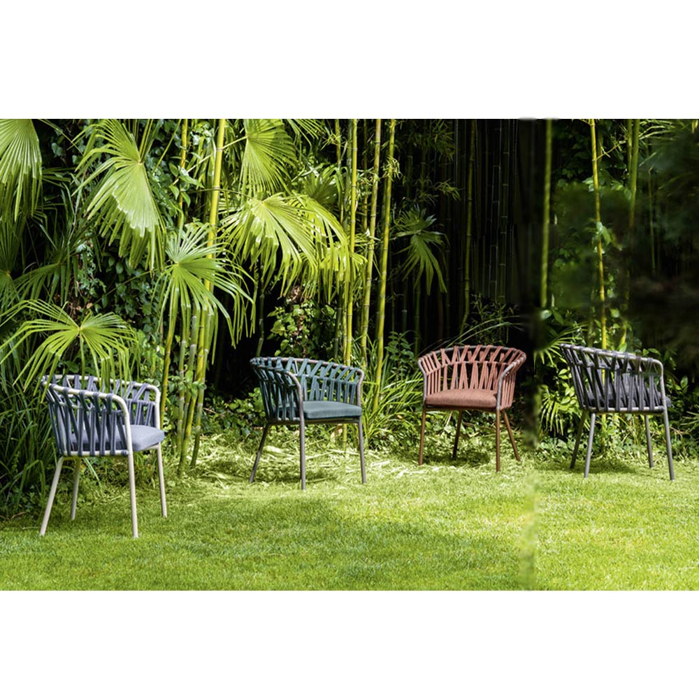 Outdoor armchair with base in powder-coated aluminum , removable seat in removable fabric and back in aluminum enriched with an intertwining of handmade acrylic fabric cords . Its design is inspired by the elegant and light shapes of the corolla of a flower and is made unique by the weaving created following a particular geometric pattern that perfectly matches the delicate and enveloping shapes of the structure that welcome and relax. What is born is a fresh and innovative furnishing solution enriched by the wonderful refined nuances thanks to which the outdoor naturalness is transformed into contemporary elegance.