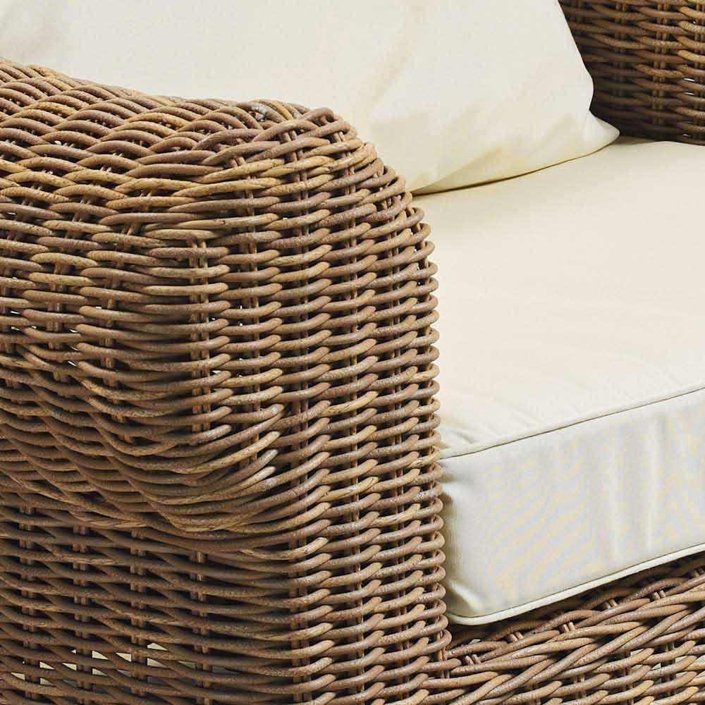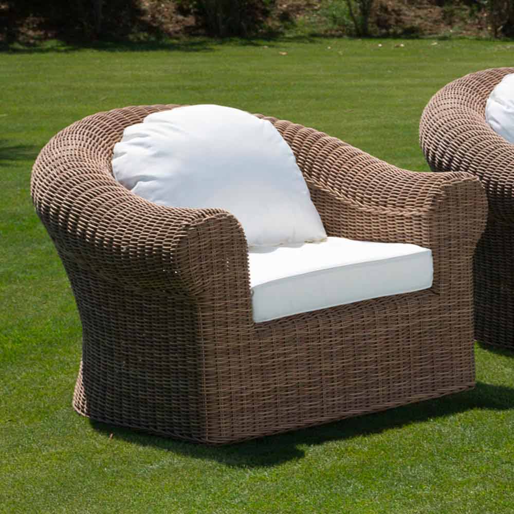 Garden armchair in precious natural woven synthetic rattan and white or ecru fabric.