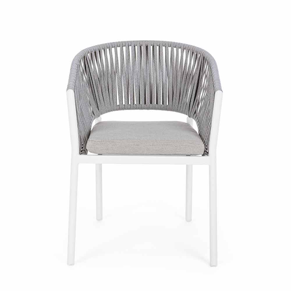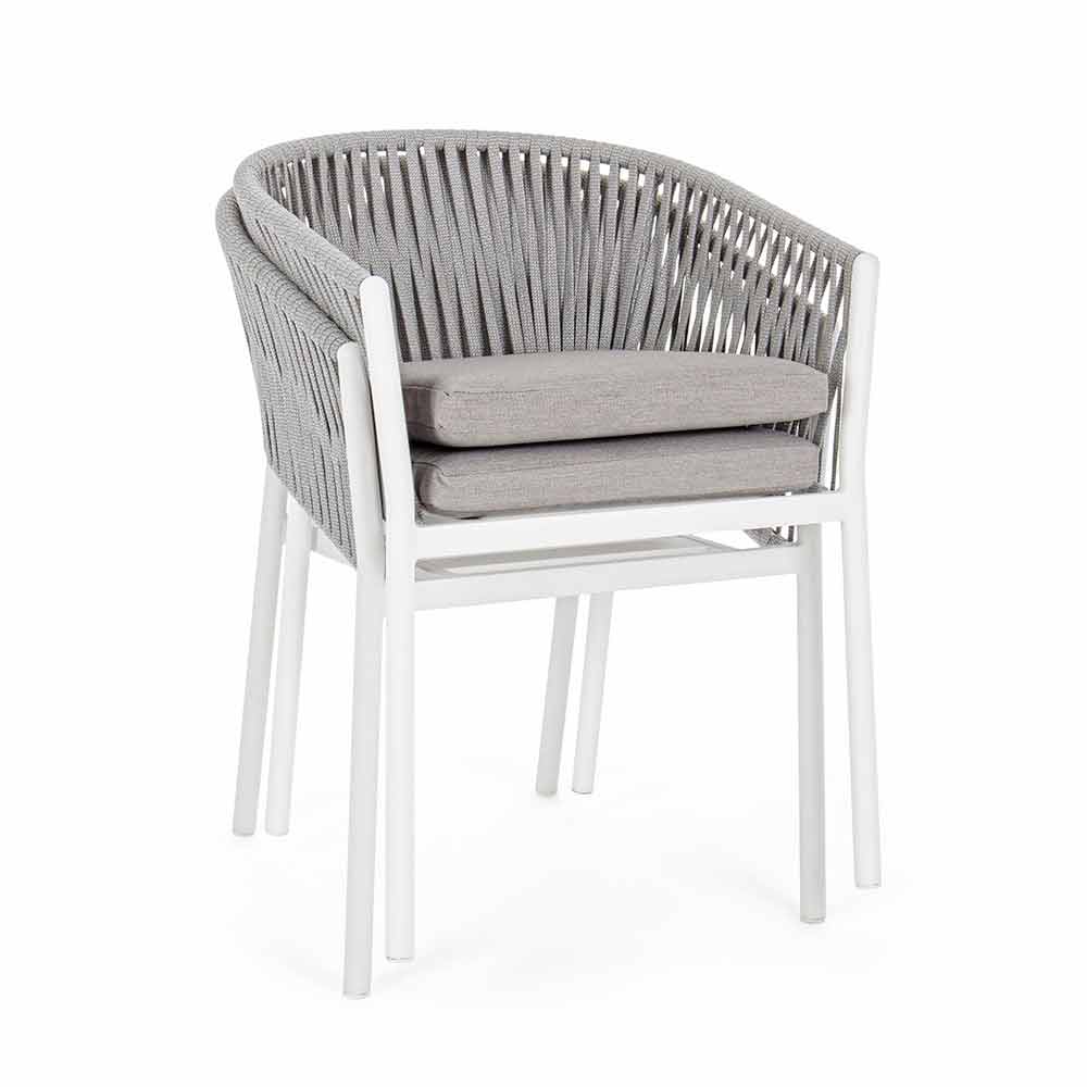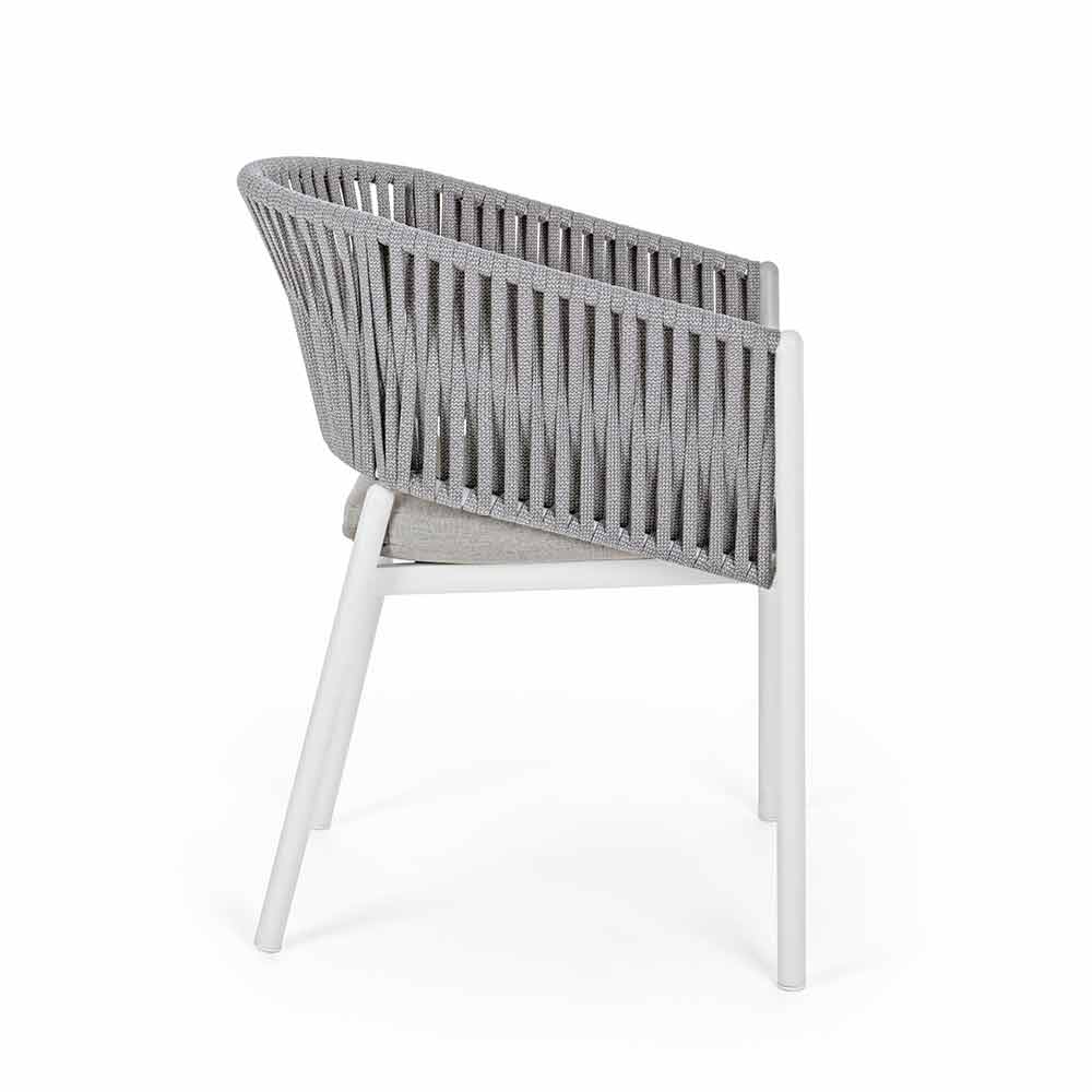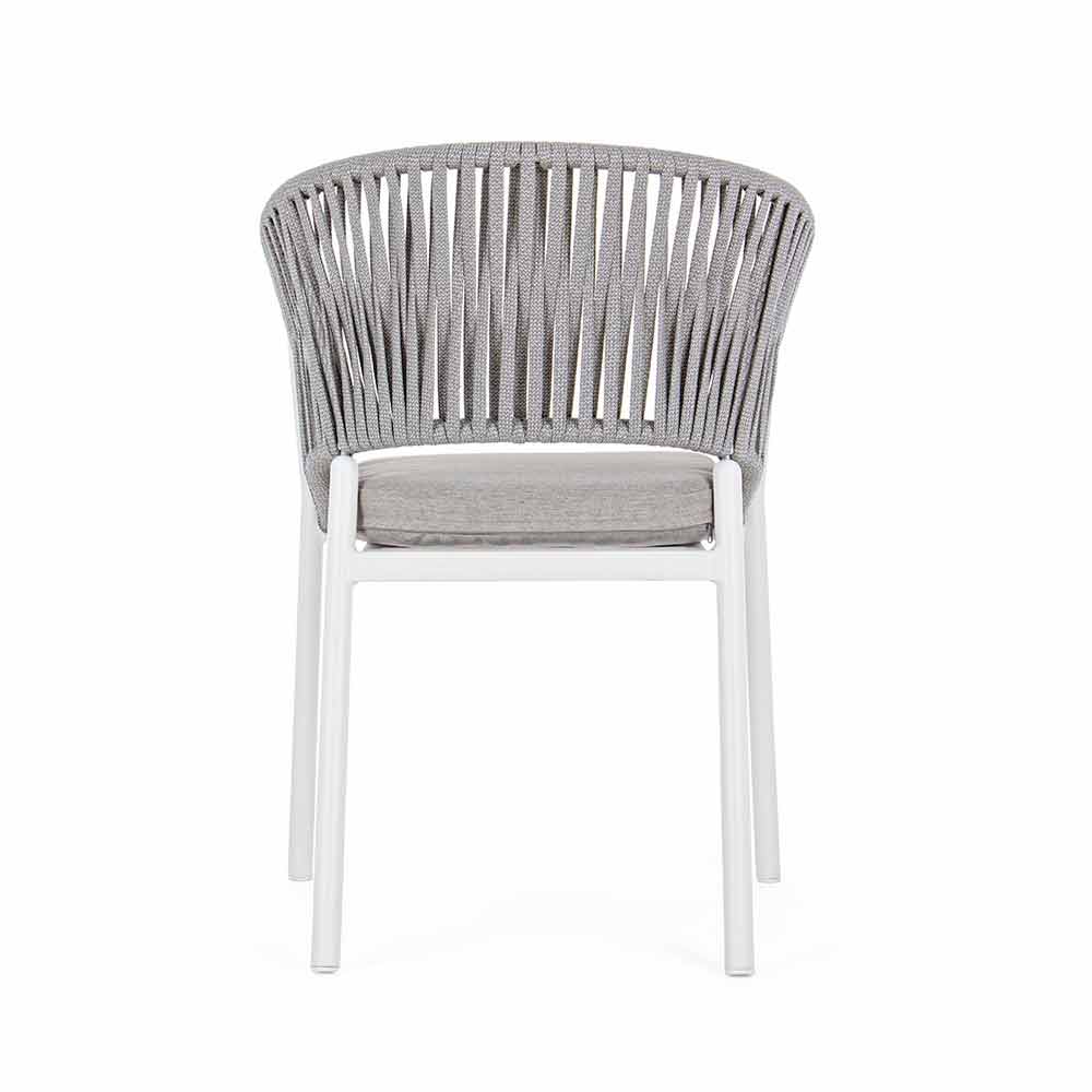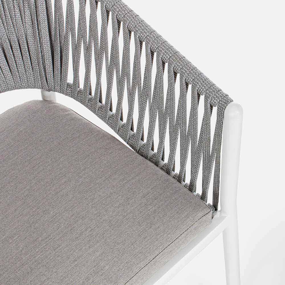 Modern outdoor chair in white aluminum with rope and cushion weaving, design, stackable.